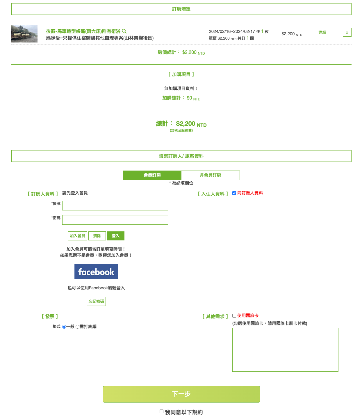 1. 選擇想要入住的房型/區域、是否加餐,點擊下方訂房連結進入營區官網