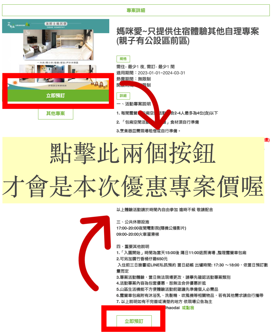 請點擊左側照片或最下方的「立即預訂」才會是「媽咪愛優惠專案」的價目表喔,請勿直接使用上方的日期搜尋(會跳出比較貴的其他專案)