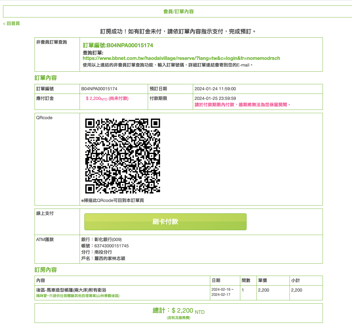 4. 確認訂房、訂購人資料內容無誤後,進行付款(可選擇是否使用國旅卡、刷卡、或ATM轉帳)付款