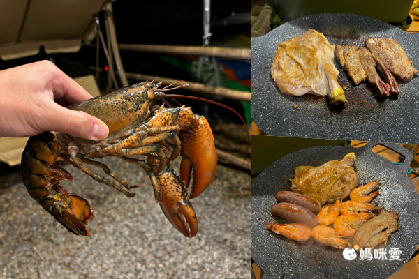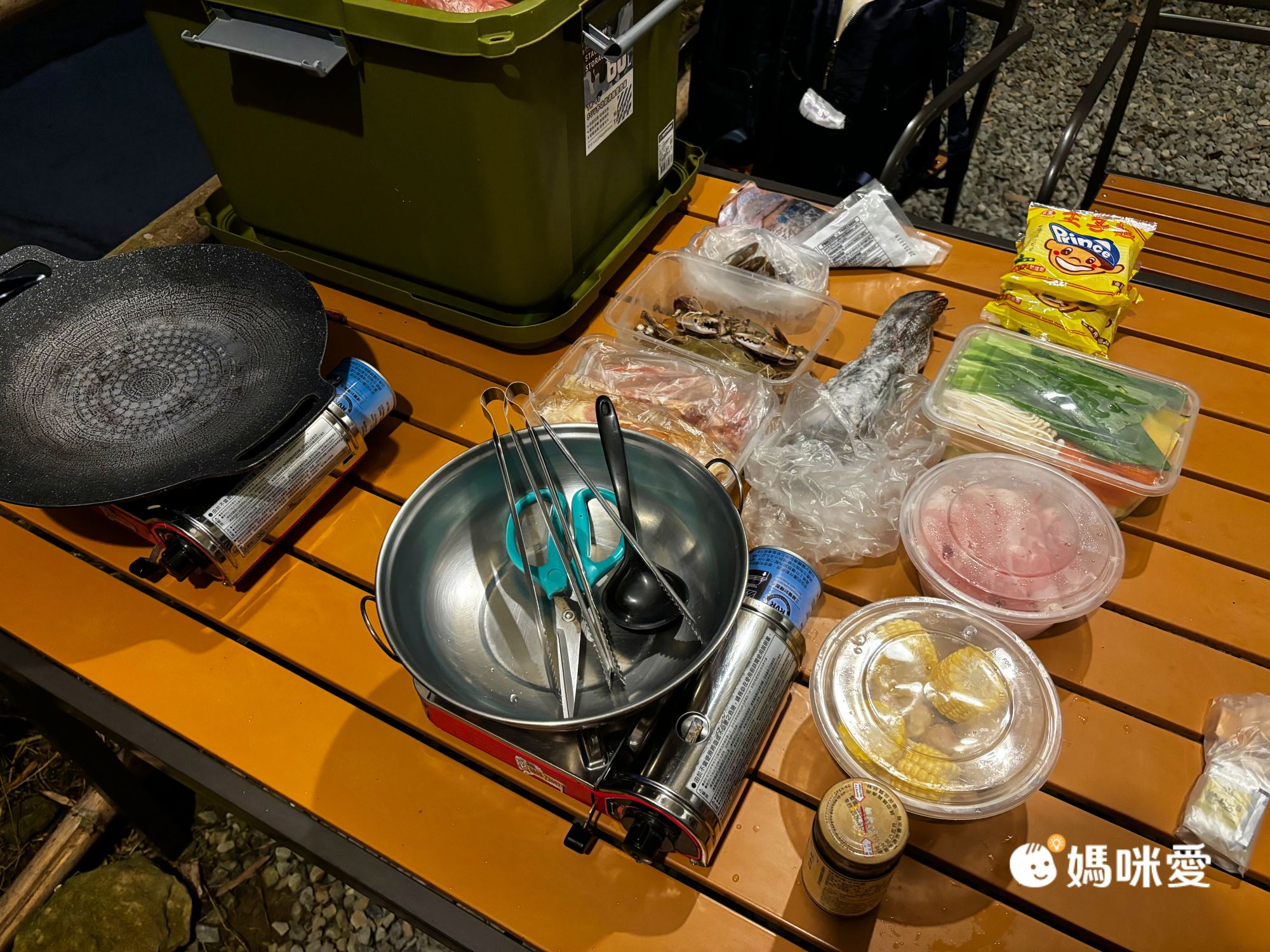 由於第一天我們到的時間沒過多久就要晚餐時間,所以我跟阿公趕緊把物資箱打開來準備火鍋跟烤肉,不打開來看還好,打開之後發現驚為天人,有螃蟹有龍蝦有蝦子有香腸、有滷過的雞排跟各式各樣的肉、有青菜玉米等菜盤、有好幾包王子麵跟湯頭塊,趕快把小孩處理好去睡覺後的我跟阿公,真的是吃到撐、吃到讚不絕口。