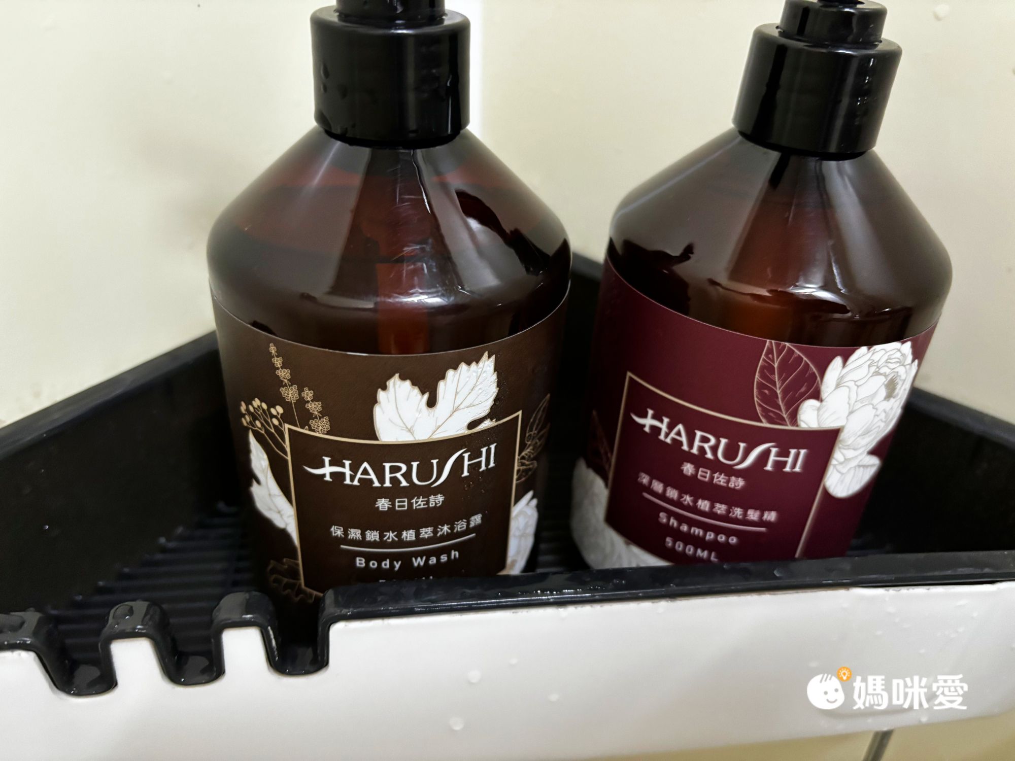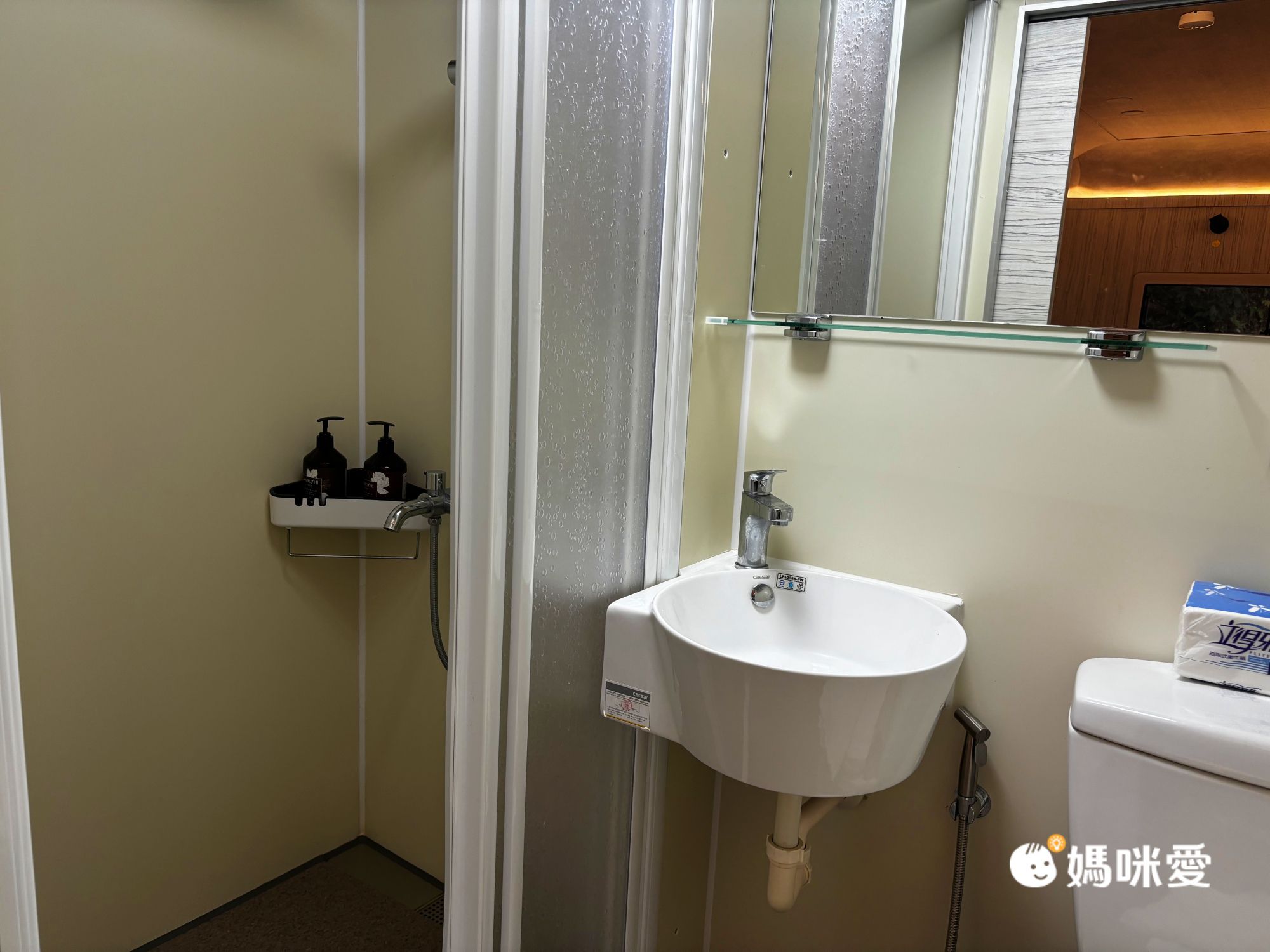 園區全館房型也都是獨立衛浴,不怕洗澡還要排隊搶位子,沐浴乳是使用春日佐詩這個品牌,不過也因為是露營車,高度部份會比較有一些限制,如果是跟我一樣比較身高超過180的爸爸,可能會稍微有一點點壓迫感,但不影響整體使用~