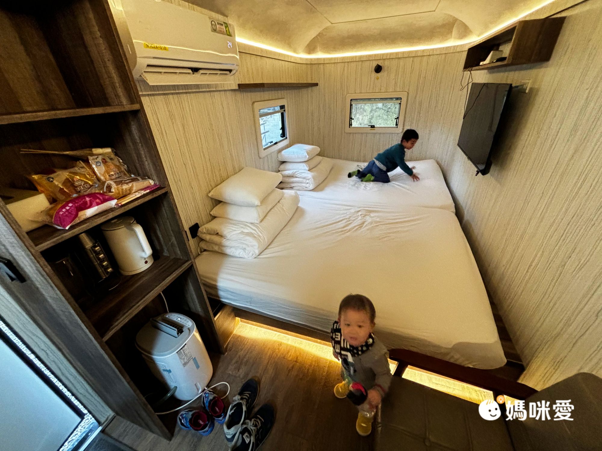 打開露營車車門後,我們入住的是最多可以睡四位,所以看到的就是兩張並排的大雙人床,非常適合帶小孩的家庭入住呢!另外有一張小沙發跟一個小櫥櫃(櫥櫃貼心的提供麵包跟泡麵,簡直對兩位大男人來說太方便了)電視機的部分沒有第四台跟網路電視,全館房型都配有冷暖空調,這點在冬天真的超、重、要!要穿短袖睡覺都沒問題!對於帶小小孩出來野外露營的家長來說,還有一個很需要泡奶的熱水,除了房內有熱水壺可以使用之外,營區也有提供飲水機可以直接取用,非常方便。