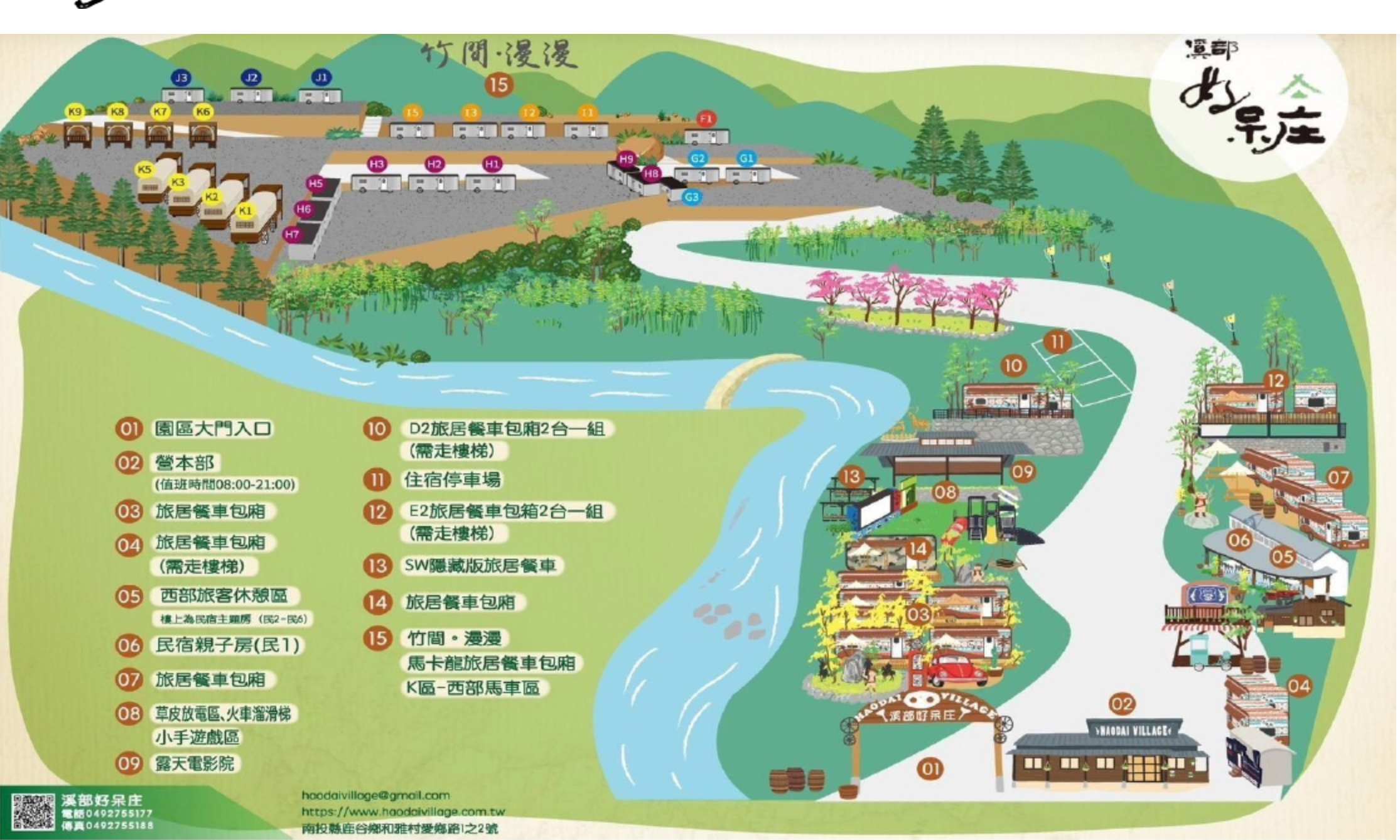 營區佔地很廣,分了兩大區,前區是營本部、民宿、印地安風格露營拖車,以及各式公設的區域,比較熱鬧也更適合親子一些(離遊樂設施較近),如果是想要欣賞山林景觀的媽咪,也有後區可以選擇,後區較為簡單寧靜一些,有豪華版露營車跟馬車造型露營車可以選擇!