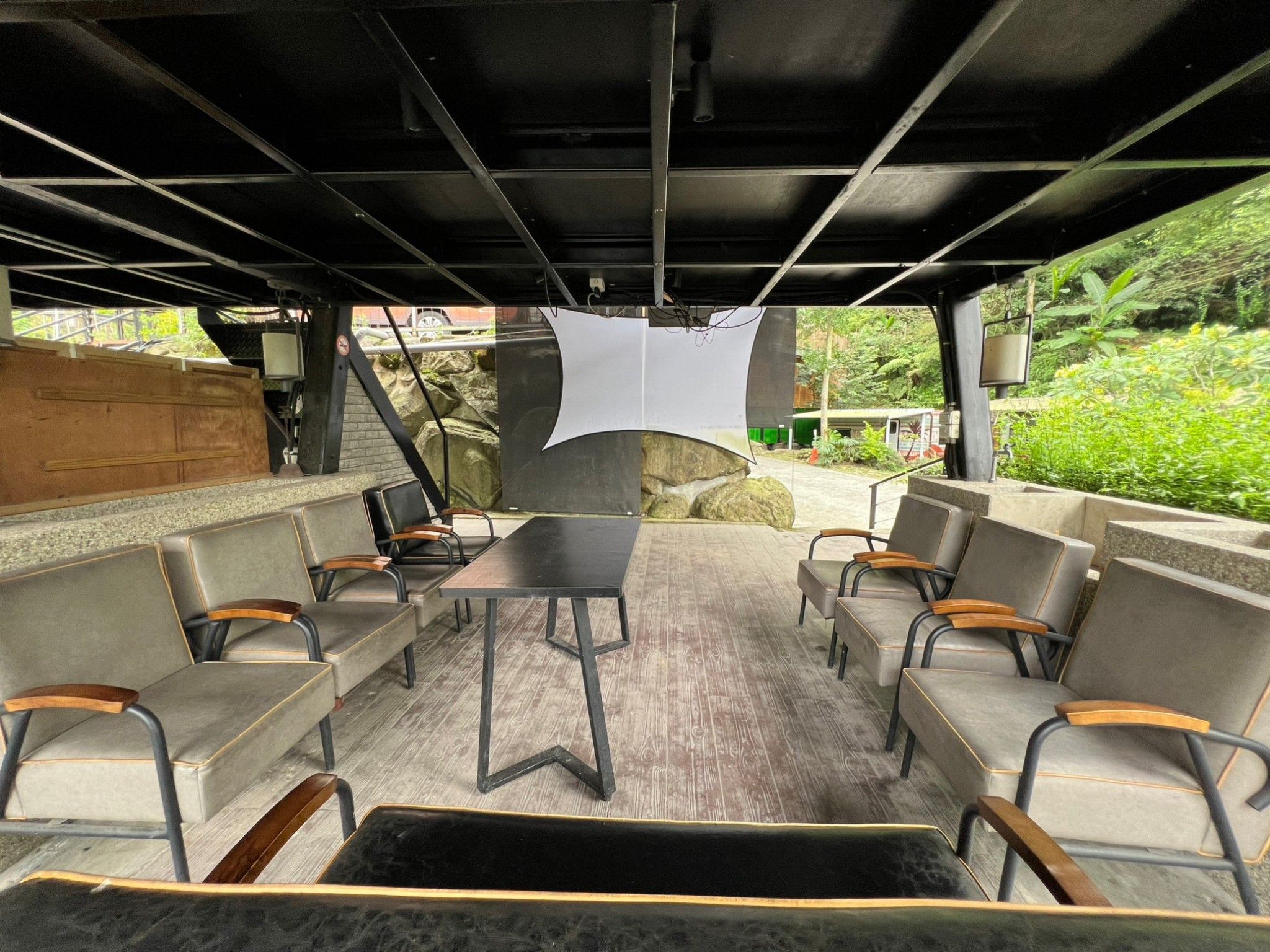 露天電影院的放映地點是個很大的開放式建築,外面還有蹺蹺板可以玩~