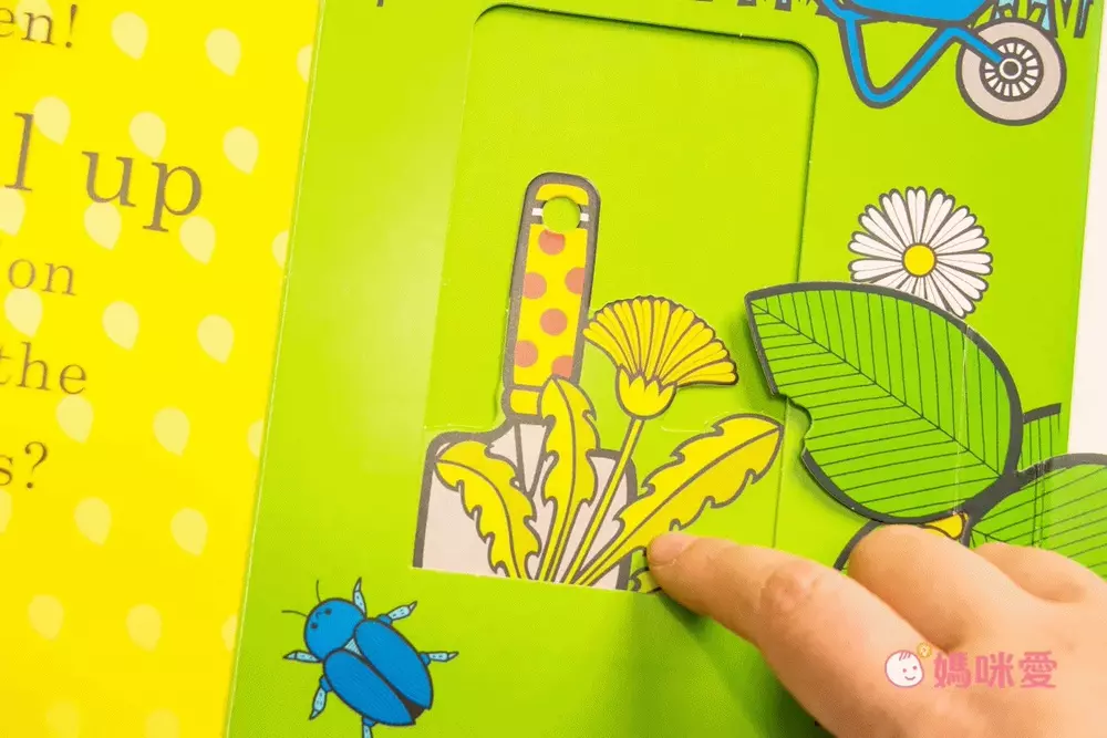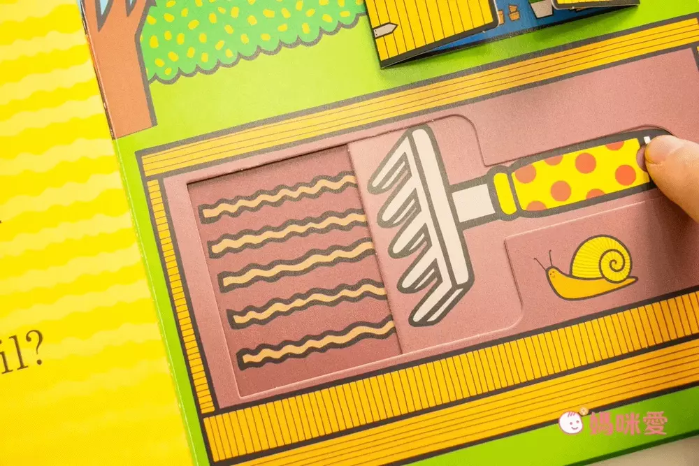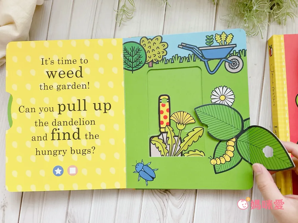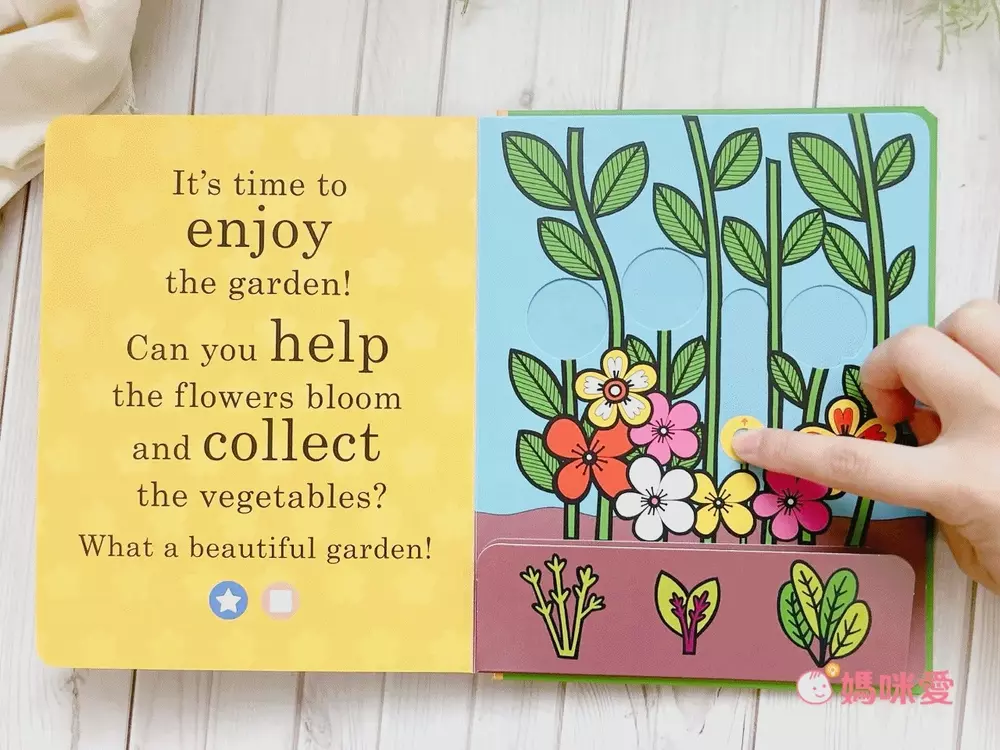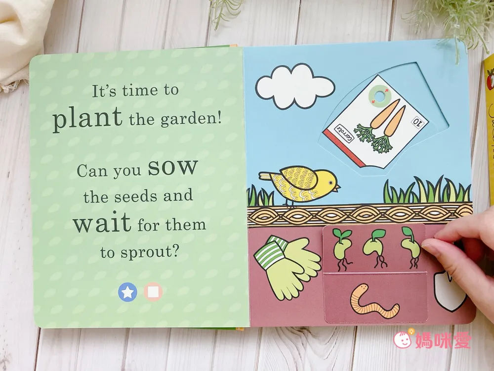 《Let's Grow!》是帶著孩子一起當小農夫的感覺:種花種水果、發現各種小動物,認識生活中一些可愛小夥伴。第一頁句子提到『整理花園時間到囉!你能找到種籽,然後把土翻鬆嗎?』動動小手打開小屋認識園藝工具,然後推動耙子機關來鬆土。讓孩子學習獨立完成指令和任務。