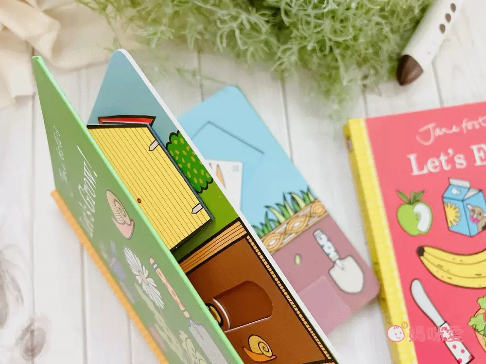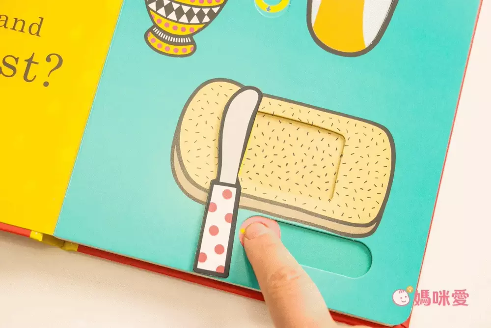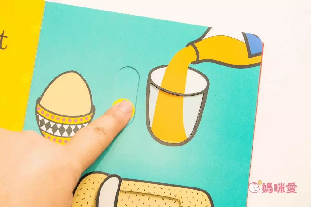 讓我覺得用心的地方是《Jane Foster's 互動操作硬頁書》的機關都設計得非常細心且寫實、生活化。像是吃早餐要塗抹的奶油吐司和倒出柳橙汁,就巧妙的利用立體翻頁機關設計出好玩又真實的互動內容,小手輕輕滑過就真的幫吐司抹上奶油!超級療癒~