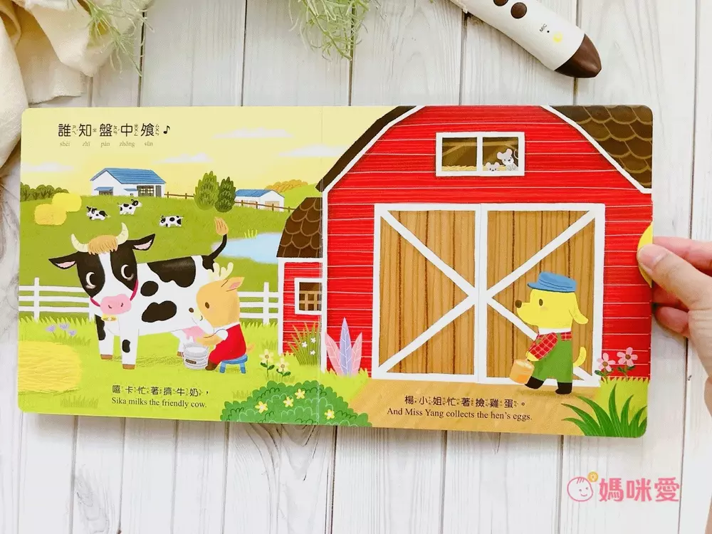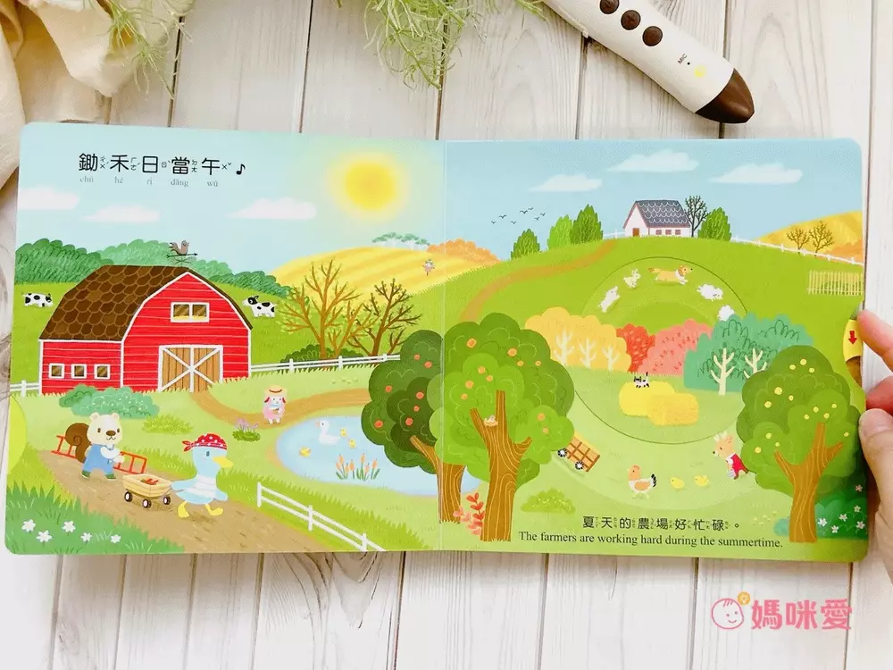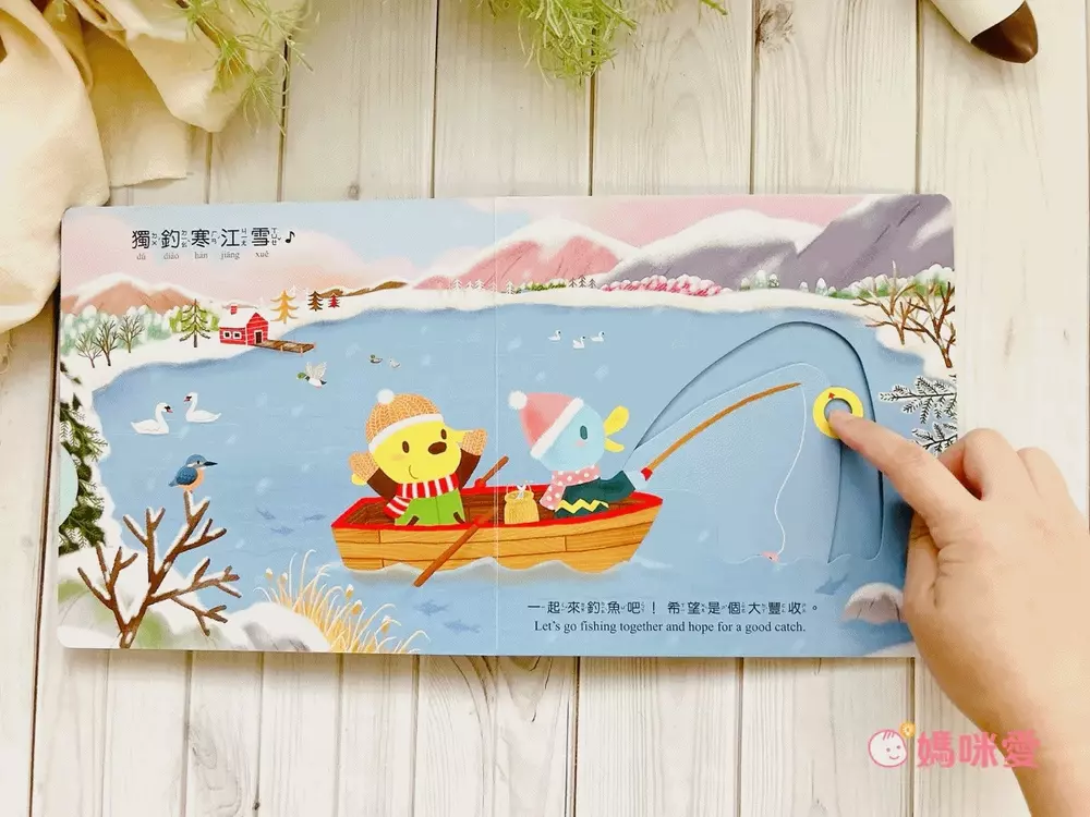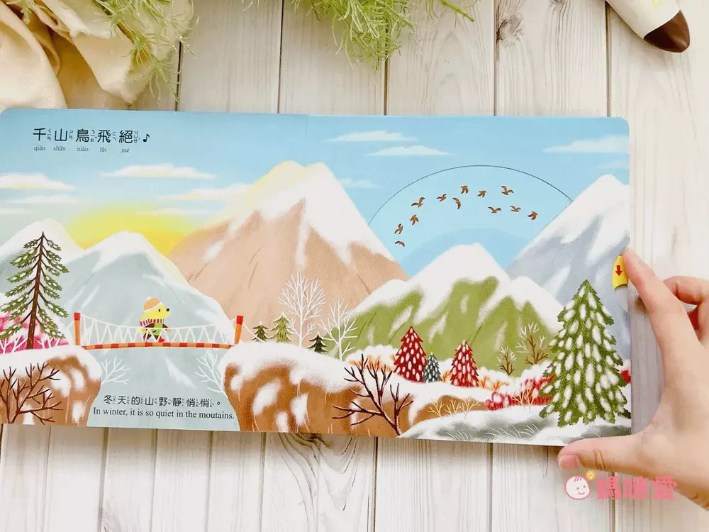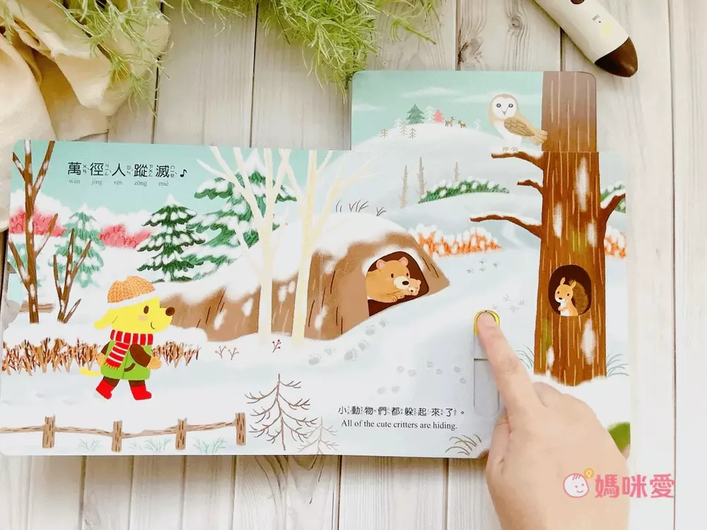 內頁可點讀的部分為:右下角的中英句子、左上角的詩句、音符、漢語拼音。點右下角中文句子將會播放中文音檔唸出句子;點英文句子則會播該英文句子。不僅如此,音檔在唸句子的過程有添加背景音樂,讓整個閱讀氛圍更活潑~