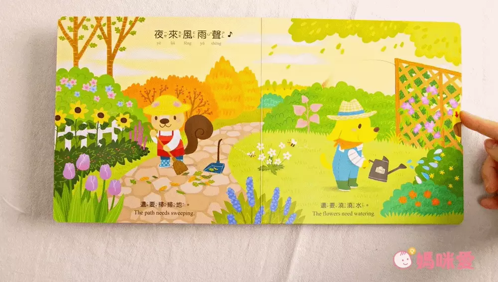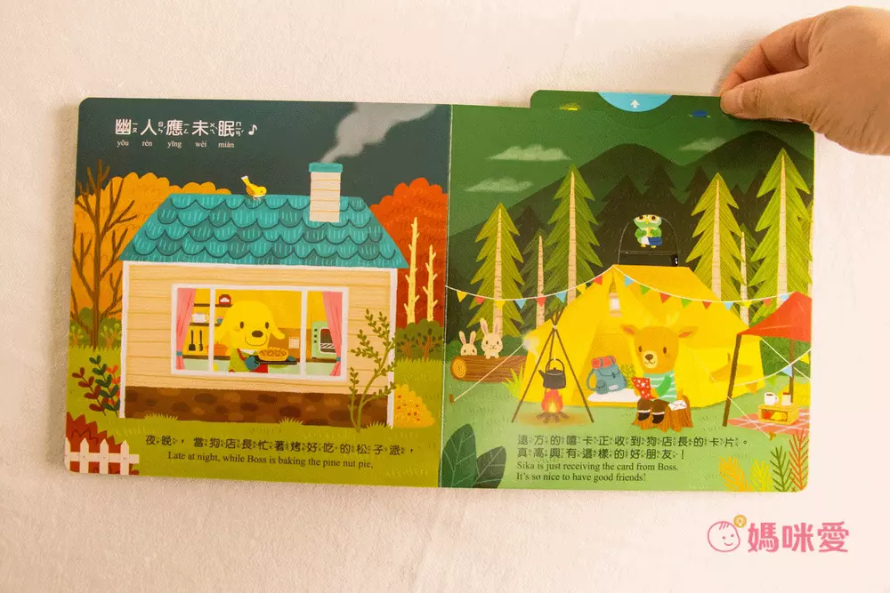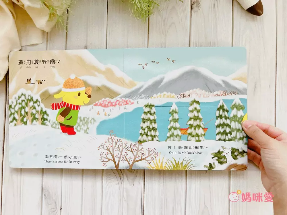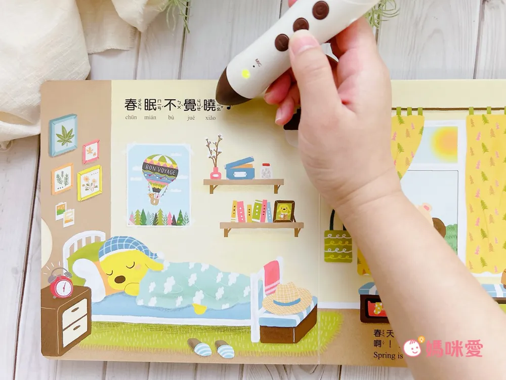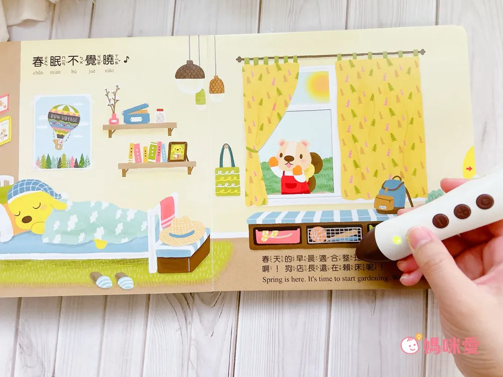 內頁可點讀的部分為:右下角的中英句子、左上角的詩句、音符、漢語拼音。點右下角中文句子將會播放中文音檔唸出句子;點英文句子則會播該英文句子。不僅如此,音檔在唸句子的過程有添加背景音樂,讓整個閱讀氛圍更活潑~