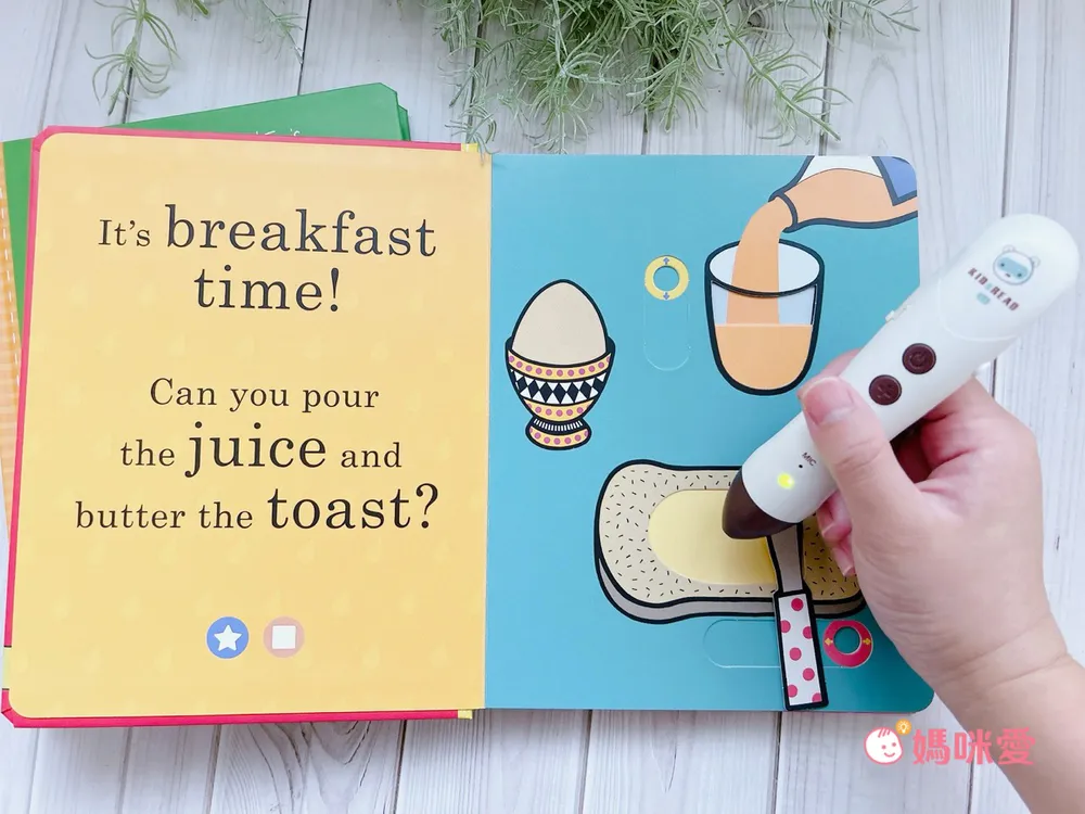 先來看看以吃和食物為主的《Let's Eat!》內容是根據一天之中的不同用餐時間。然後以其中的飲食內容來學習相關的英文單字與短句。封面的插圖都可以點讀,還沒打開內頁就能激發孩子的好奇心!裡頭還有非常多機關設計:倒果汁、倒牛奶、抹奶油、剝香蕉皮、做三明治⋯等。