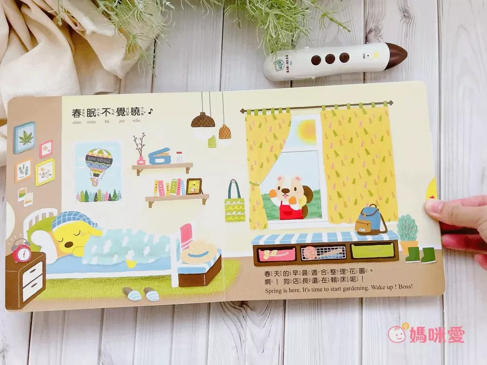 春眠不覺曉|『春天的早晨適合整理花園。啊!狗店長還在賴床呢!』早晨要去整理花園的阿諾發現狗店長還在睡懶覺!透過小手拉拉機關,讓阿諾跑到窗前叫醒狗店長。