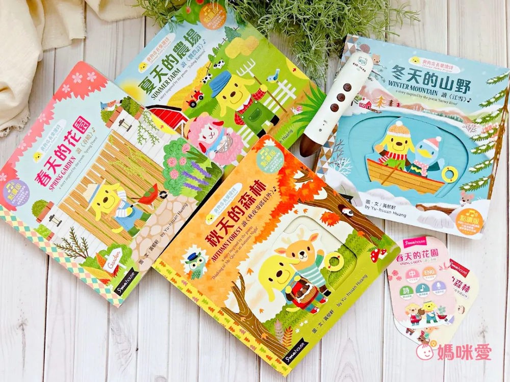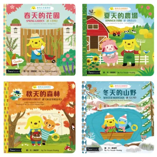 一套書裡共有4本書:春天的花園(春曉)、夏天的農場(憫農詩)、秋天的森林(秋夜寄邱員外)、冬天的山野(江雪)+隨身點讀小卡2張。透過四個季節變化,呈現大自然中各種動植物、晨昏晝夜的美麗風貌。每首唐詩均附注音+漢語拼音+中英雙語故事!不僅內容豐富、畫風精緻,讓語言學習一次滿足!激發孩子想閱讀的心~![]()