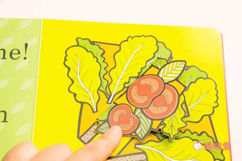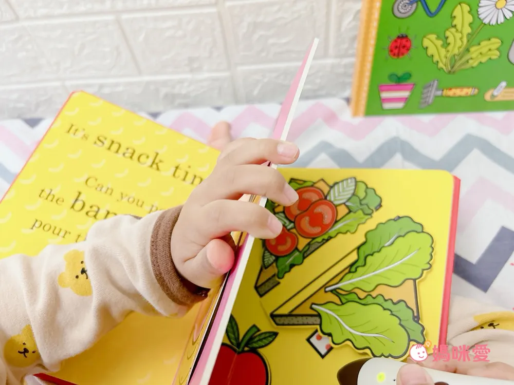 『午餐時間到了!你會做三明治和切蘋果嗎?』透過簡單問句去吸引孩子動動手操作三明治、切蘋果,操作過程中同時點讀學英文,與書本互動大幅提升。