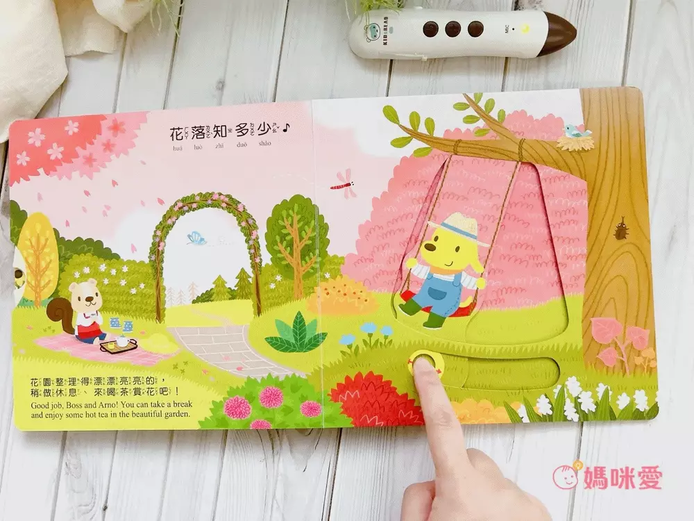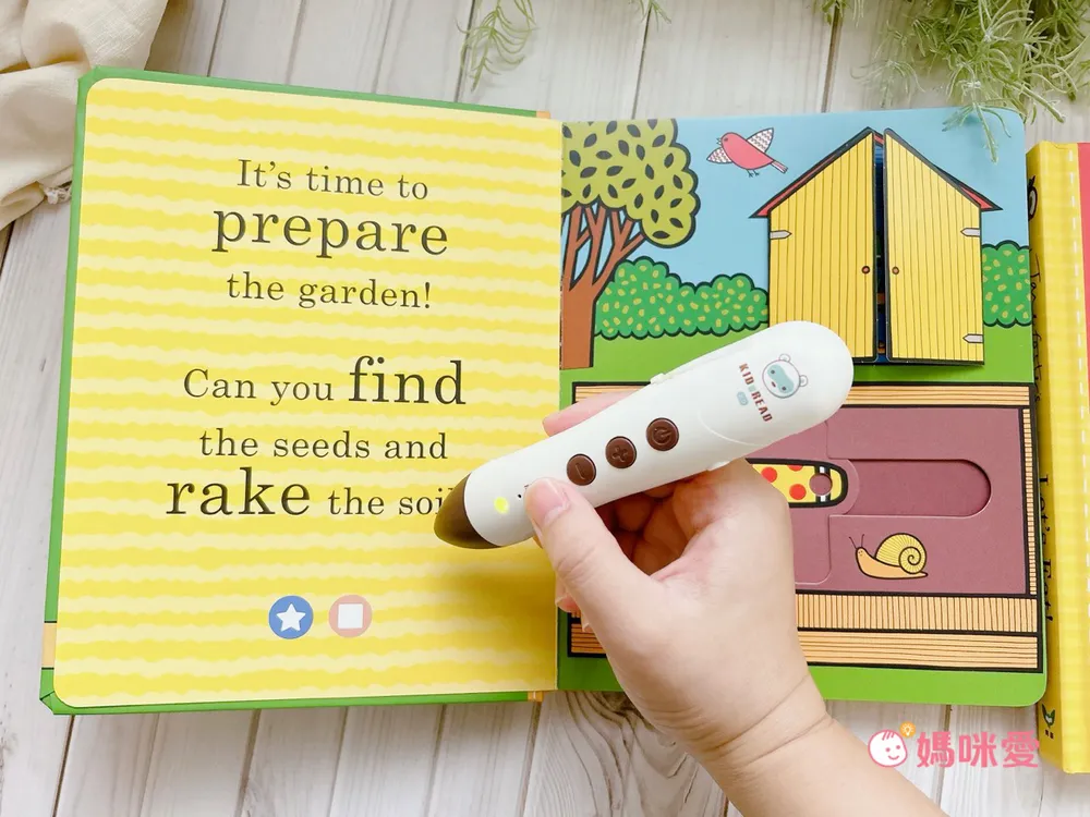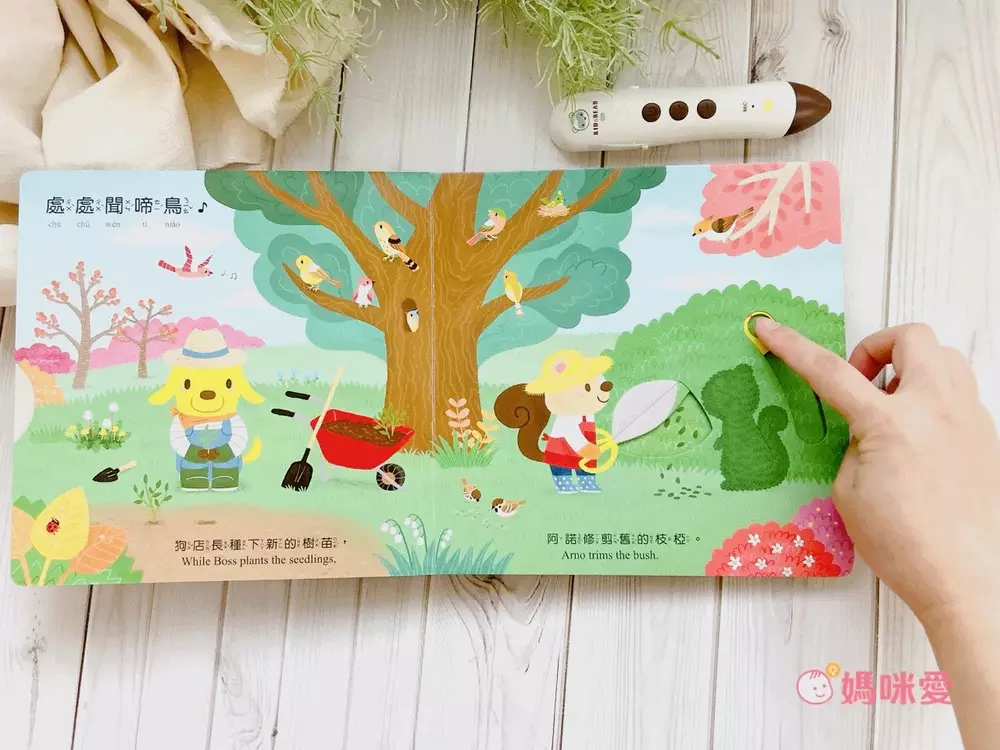點讀筆不只有英文單字的學習,還會有擬真的音效加入其中,讓孩子有種深入其境一起在種花花草草的氛圍~