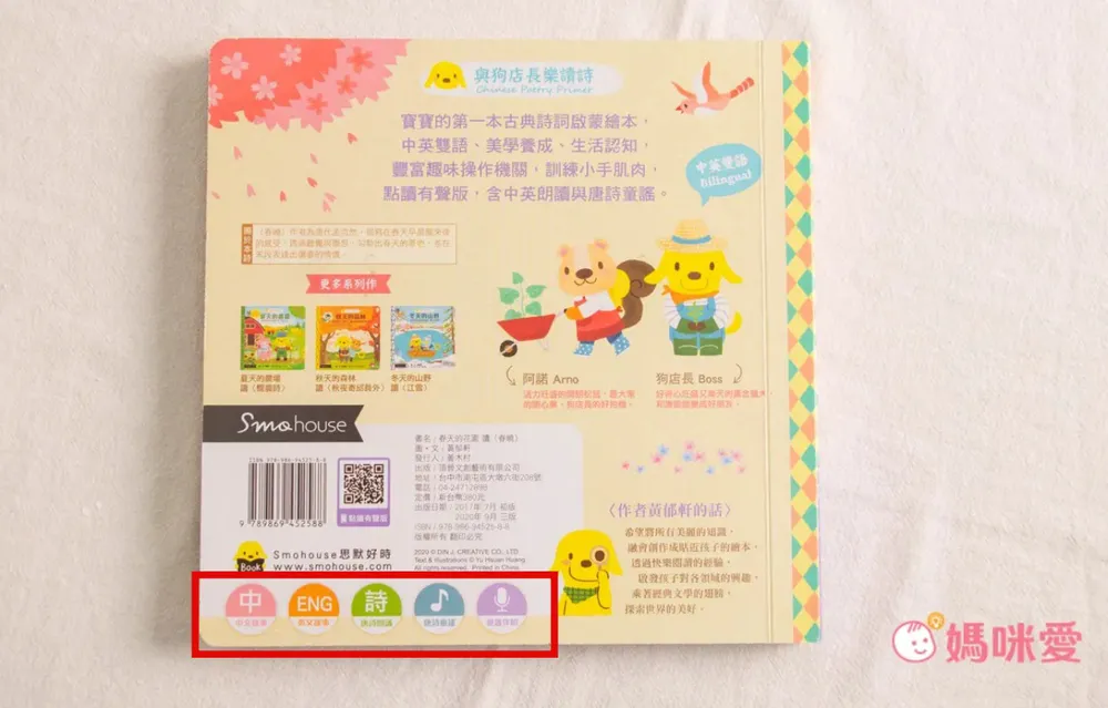 春曉全詩只有一個「春」字,卻處處流露春天的氣息。的確是首膾炙人口的好詩!書本背面左下角還有5個點讀按鍵,從左到右分別是:中文故事、英文故事、唐詩朗誦、唐詩童謠、童謠伴唱。