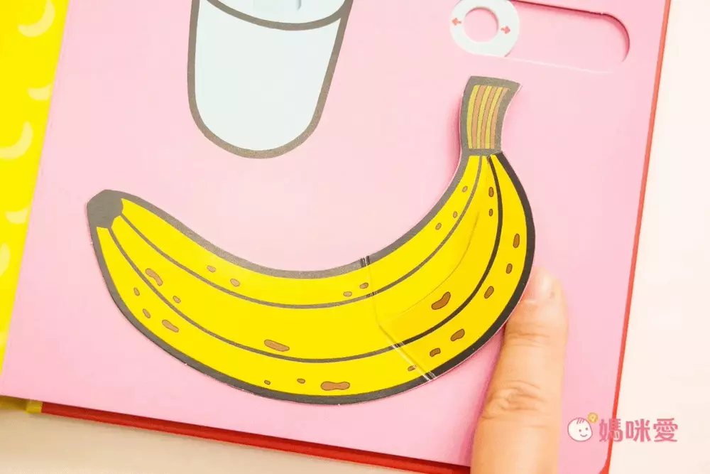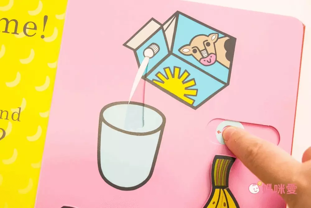 點讀插圖中的物品,可以學到牛奶、一盒牛奶、牛、太陽、玻璃杯、香蕉、香蕉皮等單字,驚喜音效還能聽到牛叫聲、倒牛奶聲。向右推動機關,紙盒中的牛奶就會倒出![]()