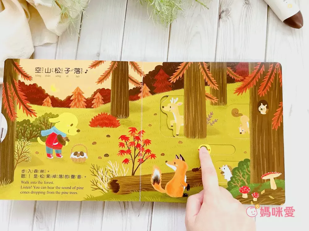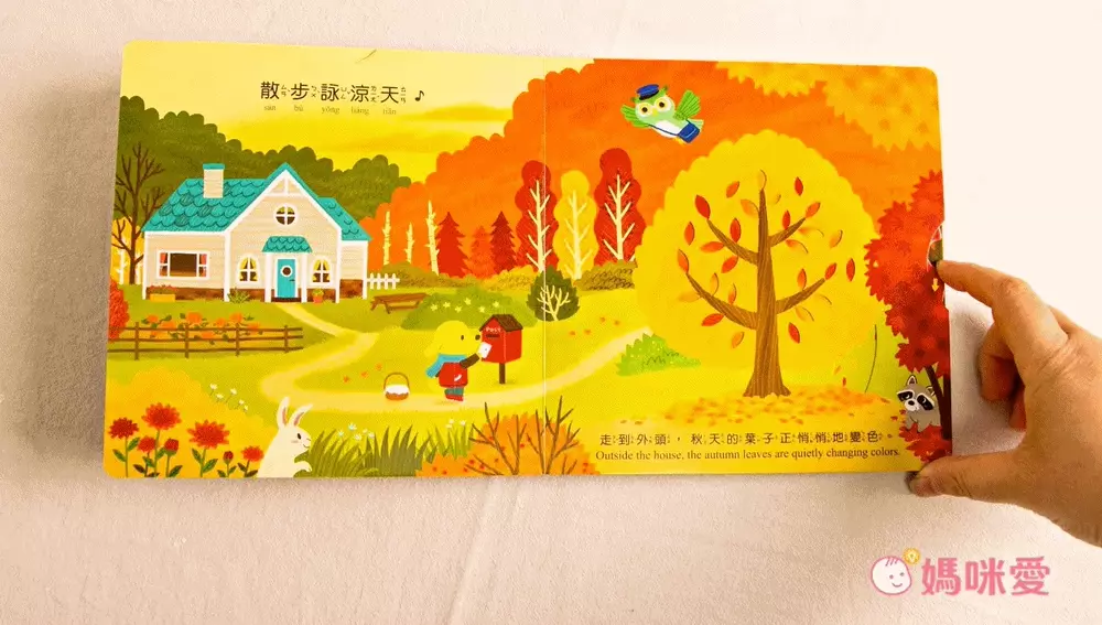 共讀時能帶著孩子一起認識秋天的事物:涼涼的天氣、變色的秋葉、掉落的松果做成好吃的松子派,都是秋天才有的景物。![]()