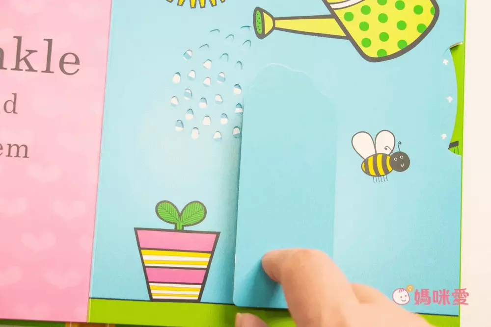 掀開翻頁,矮小的盆栽立刻長高開花,蜜蜂也趕緊來採蜜!