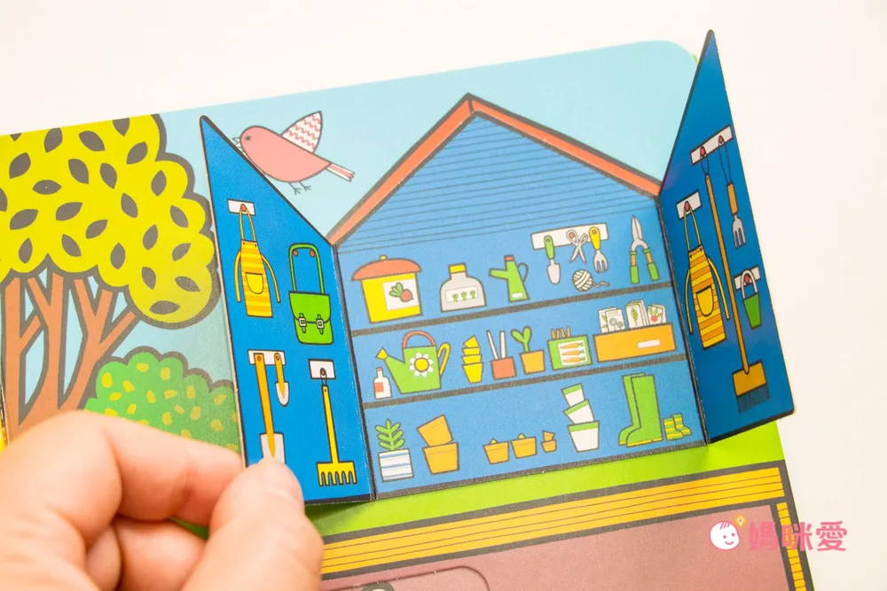 這本主題又學得更細了!會這樣說是因為將第一頁的小屋打開後,有超級多的小物件隱藏在這,而且每樣都能點讀,很像挖到寶的感覺XD有圍裙apron、犁耙rake、鏟子spade、澆花器watering can、盆栽plant、肥料fertilizer、剪刀scissors、花剪clippers、掃把broom、水桶bucket、植物種籽plant seeds、雨鞋wellies等英文。