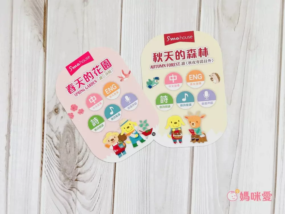 外出必備!想在外出時、車程中讓孩子聽聽唐詩,只要帶2張小卡+點讀筆即可!卡上的5種功能與每本書背面的5個按鍵相同。一樣有中文故事、英文故事、唐詩朗誦、唐詩童謠、童謠伴唱。