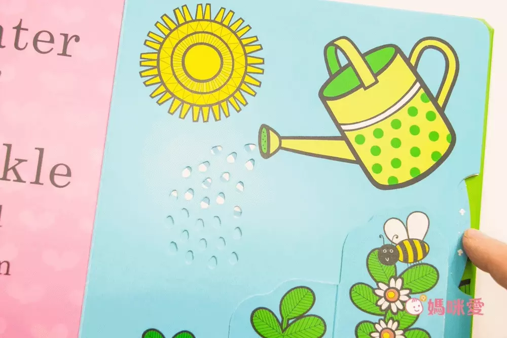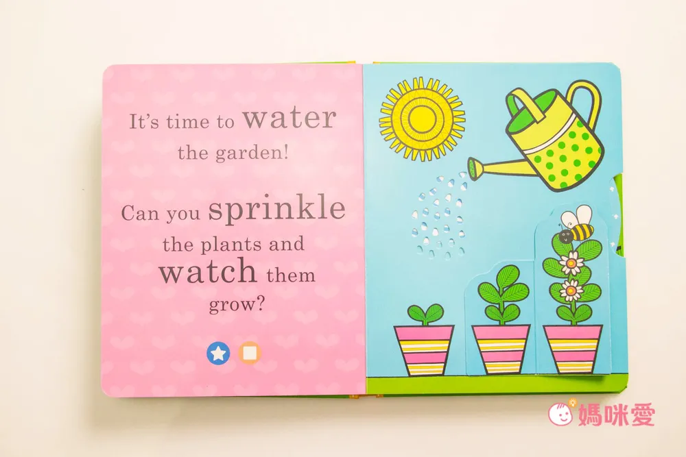『澆花時間到囉!你能幫盆栽澆水,然後看它們長大嗎?』可學到澆水器watering can、水water、花盆flower pot、嫩芽sprout等英文。問答遊戲:太陽在哪裡?你能找到花園裡的兩隻蜜蜂嗎?請數數看有幾個花盆。