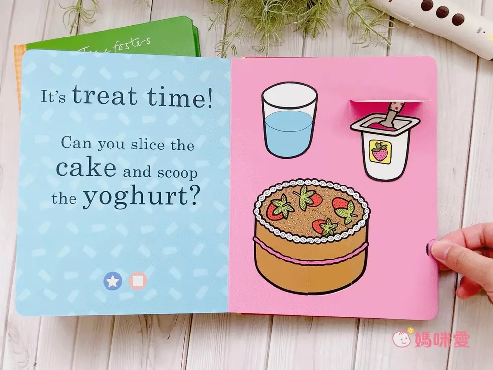 再來是飯後甜點時間!你會切蛋糕和用湯匙舀優格嗎?(向右拉動機關,就能將蛋糕切片)。問答遊戲除了會考考小朋友對物品的認知,也會考驗數數!例如:蛋糕上有幾顆草莓?孩子用點讀筆依序點出蛋糕上的4顆草莓(同時點讀筆也會發出one,two,three,four提醒孩子現在點到第幾顆),點選完畢後會聽到“叮咚叮咚”音效聲,表示答對囉!