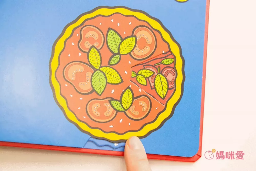 轉動轉盤,就會發現披薩上出現不同種配料,而每個配料也都能點讀認識食材:起司cheese、青椒bell pepper、蘑菇mushroom、培根bacon、鳳梨pineapple、羅勒basil、義式臘腸pepperoni、黑橄欖black olive、洋蔥onion等英文語詞。實在有趣!