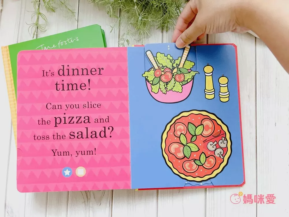 最後是晚餐時間!你會切披薩和拌沙拉嗎?在閱讀過程中,蠻建議孩子可以在一頁點讀、操作完後馬上開啟問答遊戲模式,讓孩子對英文問句、單字、認知更增加學習印象。