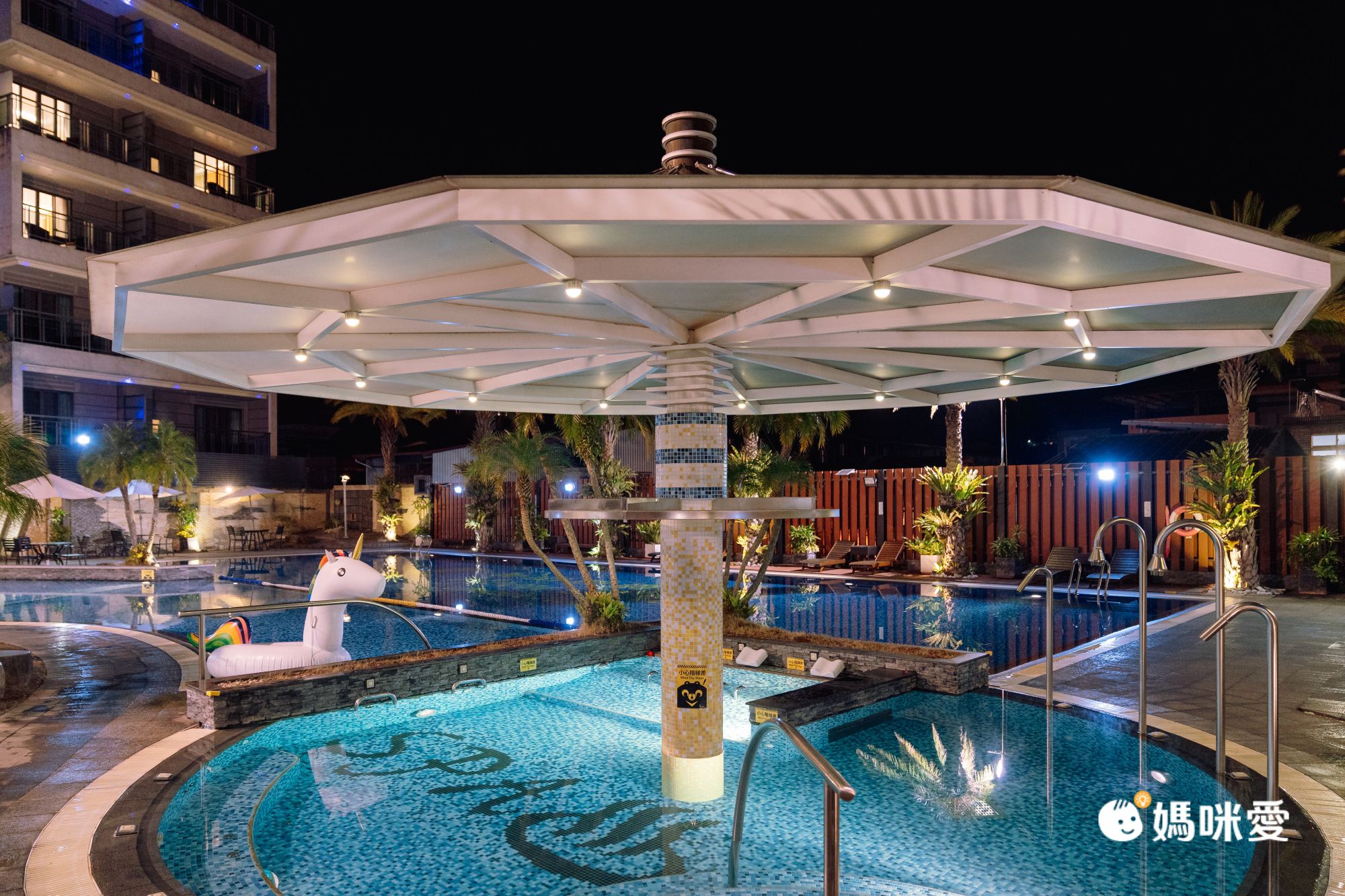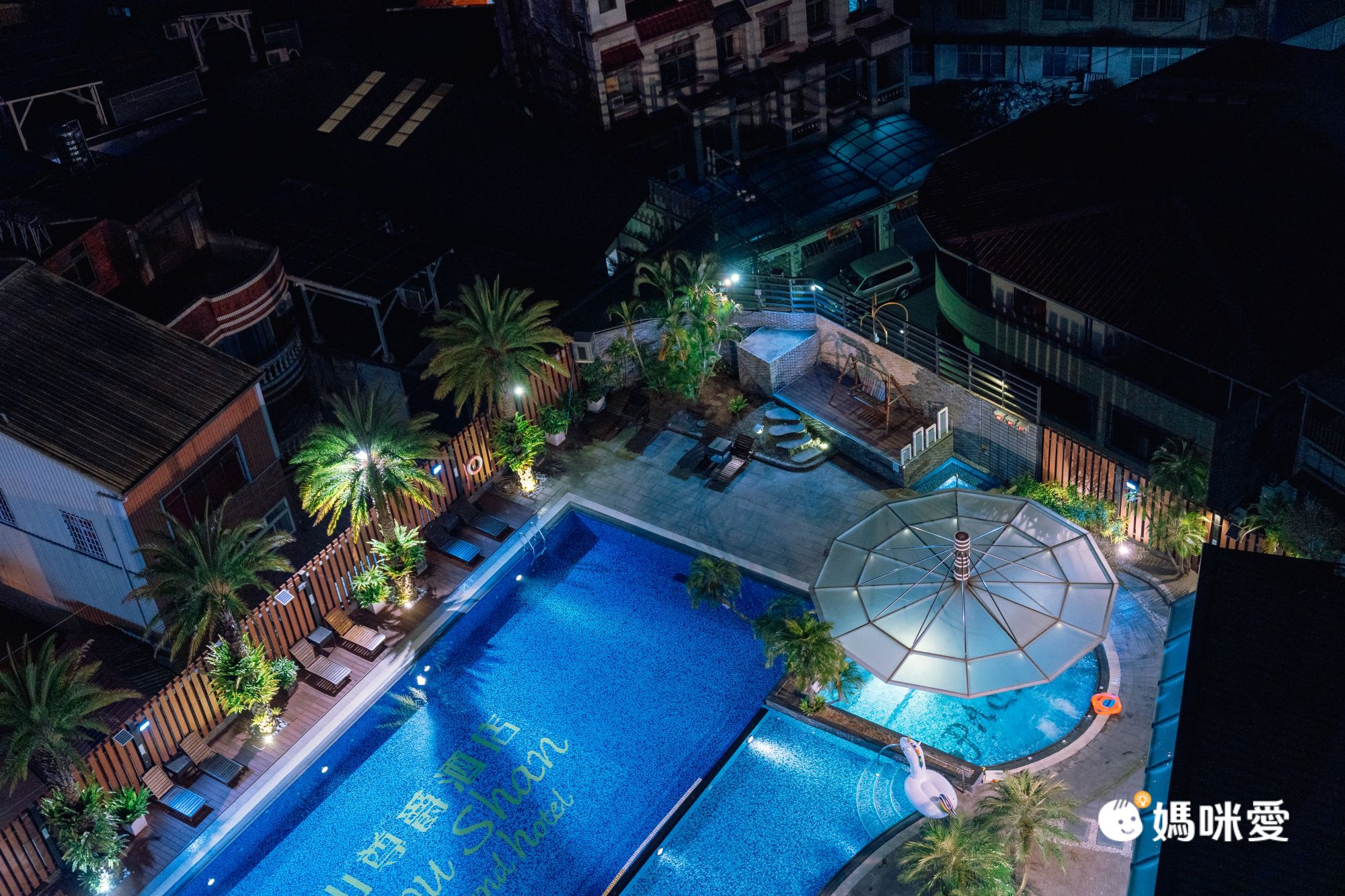 【承萬尊爵渡假酒店】這座超寬廣的露天泳池絕對是最大看點!不僅四季都有開放,還有兒童戲水池、溫水SPA池、三溫暖等設備,晚上來場星空夜泳也超有氣氛的!