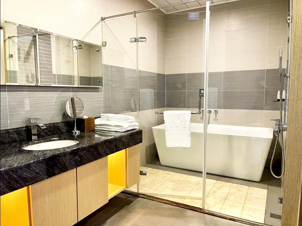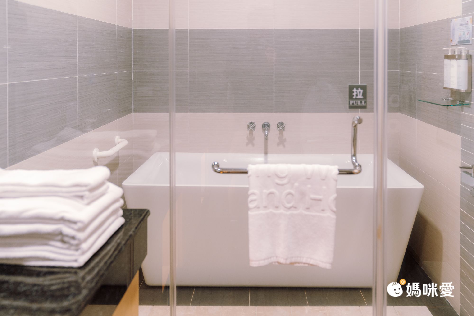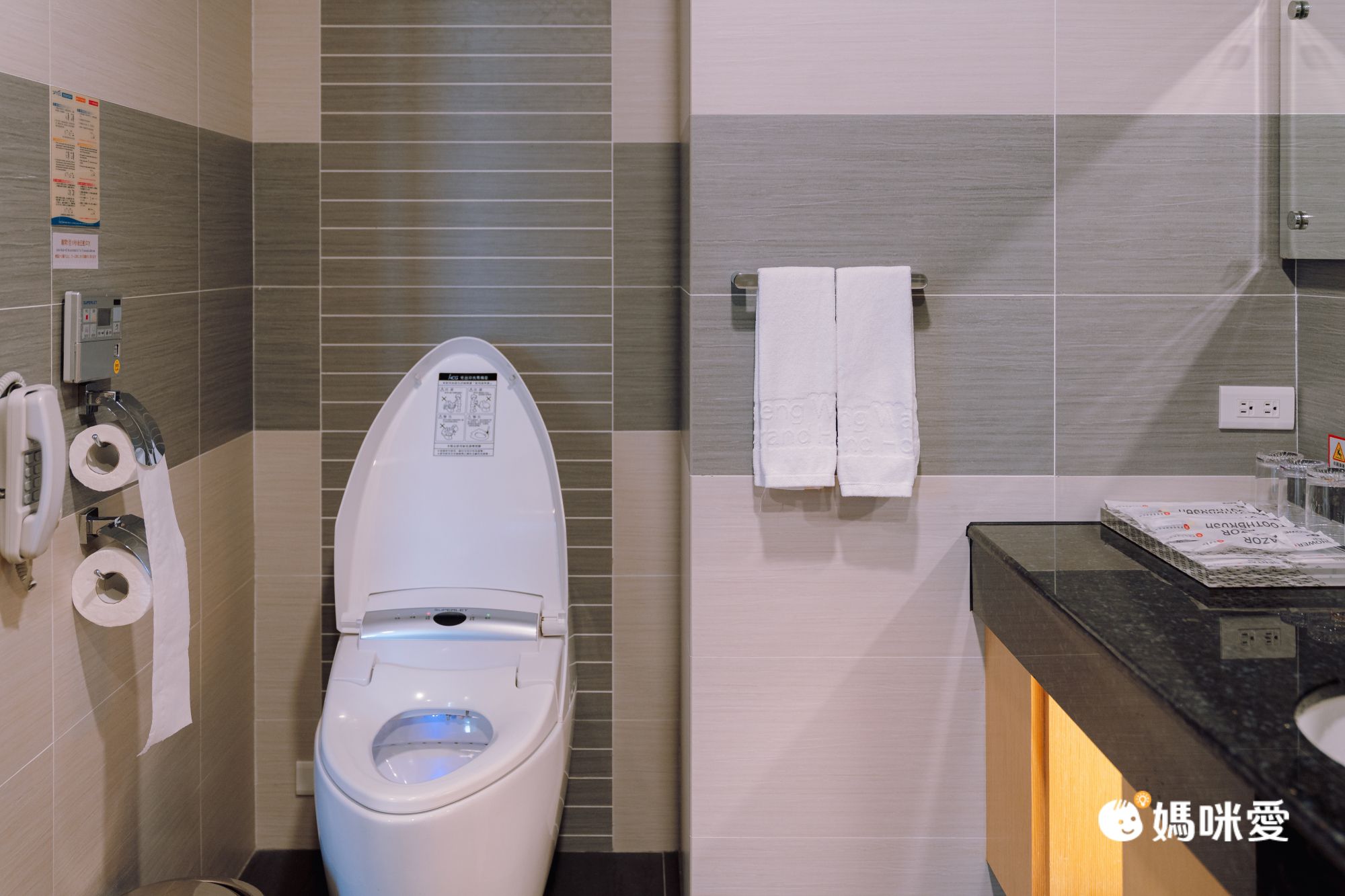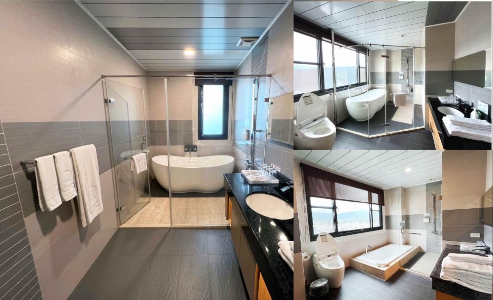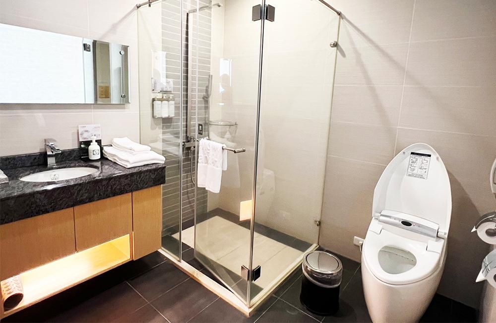 館內每間房間都有配置免治馬桶!這次入住的時尚四人房還有浴缸喔!(麗緻四人房為乾濕分離淋浴)
