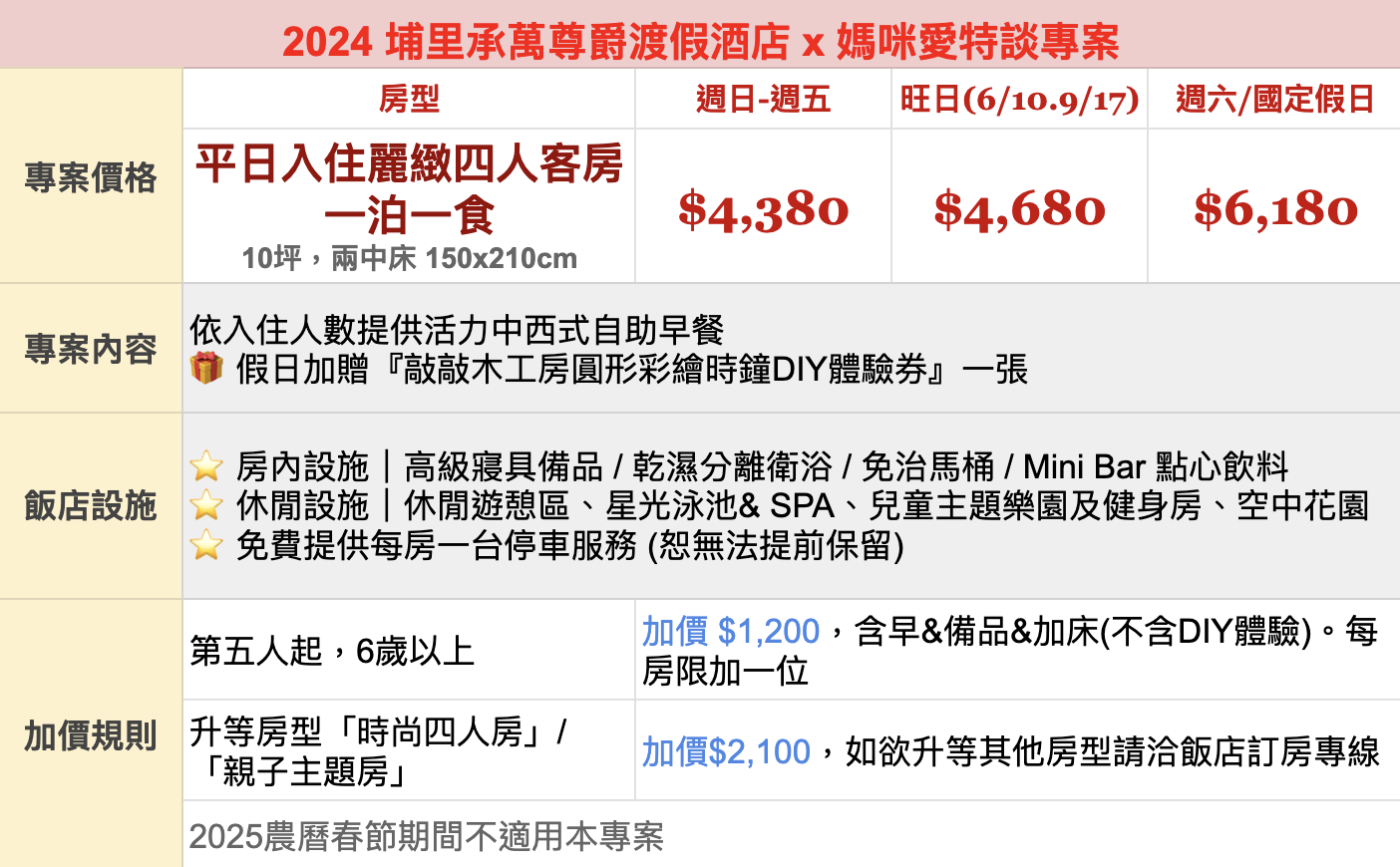註:本次專案為「平日四人入住麗緻四人房含早」,每房限入住四大一幼(未滿6歲),超過人數/年紀需加價,第五人起(6歲以上)加價1,200入住,含早&備品&加床(不含假日DIY體驗)。每房限加一位入住。