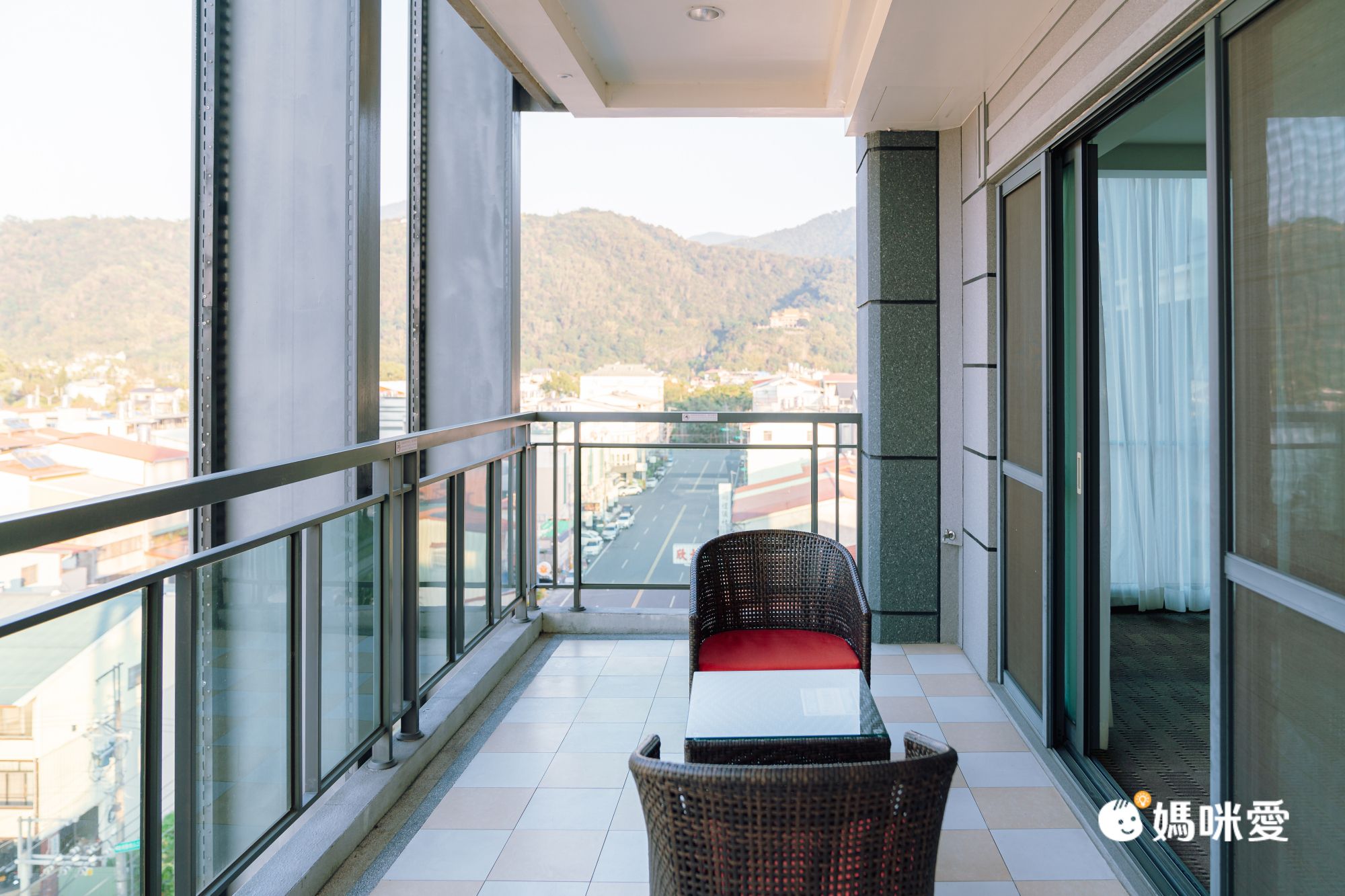 陽台也是很寬敞、也配有簡單的桌椅可以讓旅客欣賞埔里市景、遠眺山嵐風光!