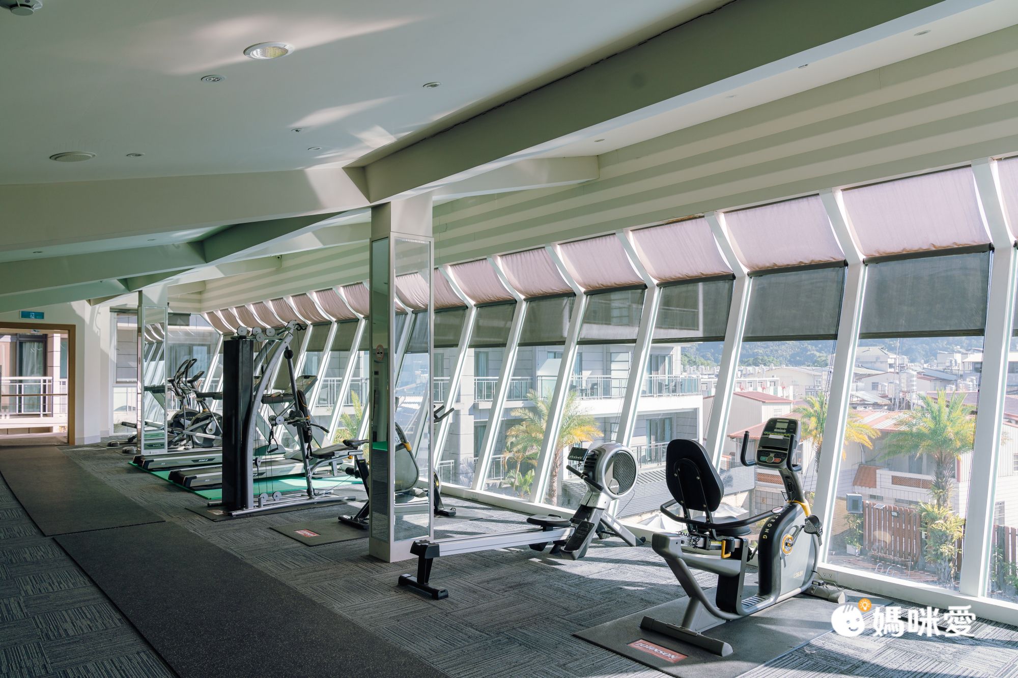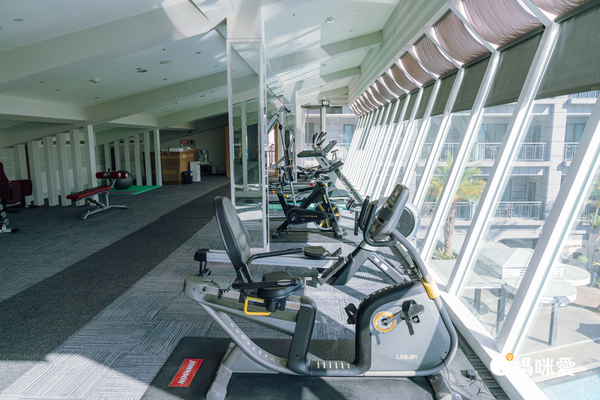 健身房位於六樓,空間大、景觀好,落地窗設計,白天運動可以邊運動邊欣賞山景及泳池景觀呢。