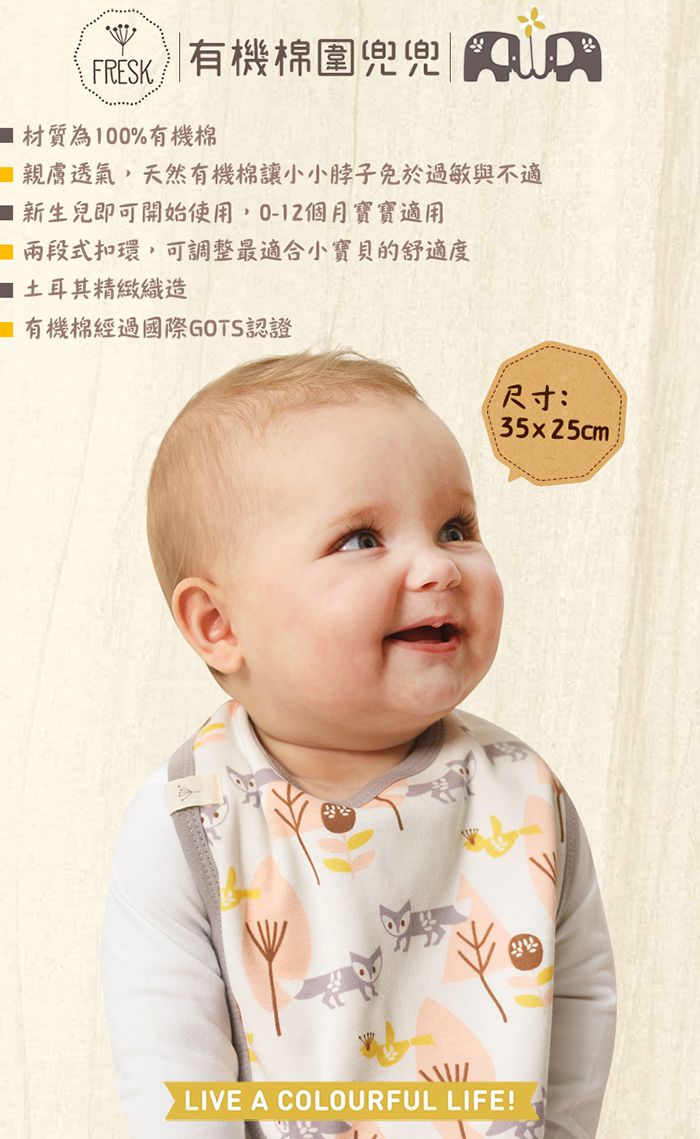 材質為100%有機棉~親膚透氣!讓寶寶脖子免於過敏與不適~兩段式扣環,可調整最適合寶貝的舒適度!