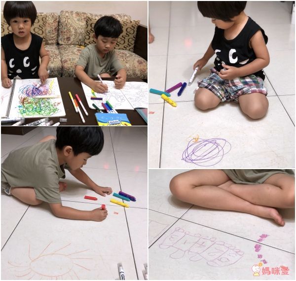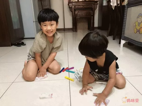 雖然哥哥丹丹已經會拿畫筆了,但對才剛 2 歲的弟弟麥麥來說,還需要鍛鍊手指力氣呀!我乾脆讓他們兄弟趴在地板上一起玩~只要家裡有白色磁磚,畫布想多大就有多大啊~!