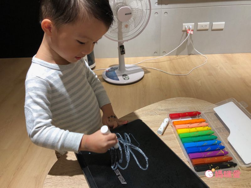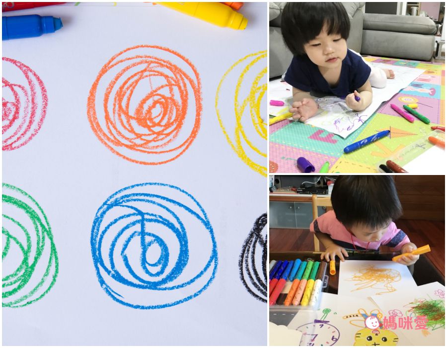 兩歲半的叡叡雖然還不是很會畫,但也非常喜歡揮灑顏色,這種旋轉式筆套不會弄髒手,實在太得叡叡媽的心了,因為最怕的就是小孩吃手手!