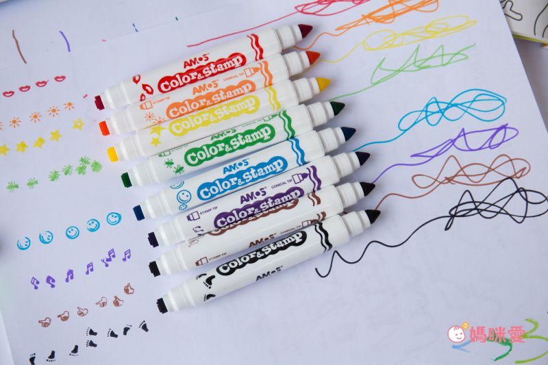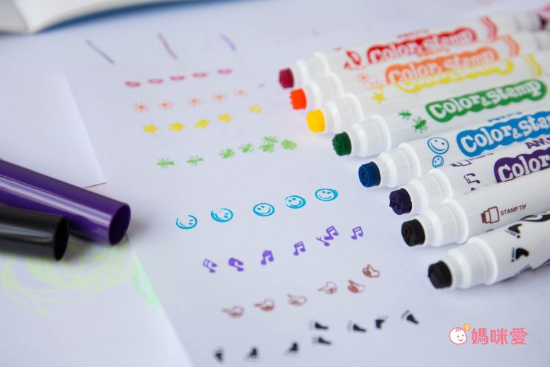 「印章彩色筆」有兩種筆頭,彩色筆+印章二合一!當然顏料同樣是可水洗設計,如果畫到手上身體都不用擔心唷~