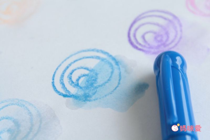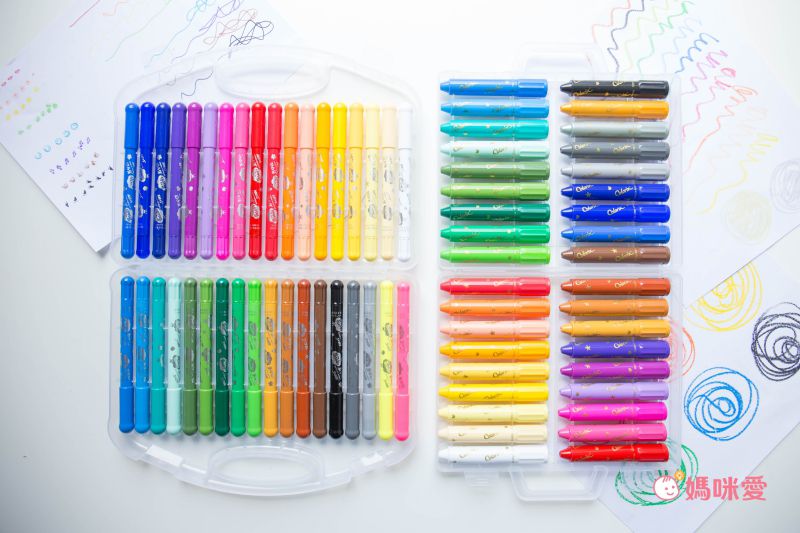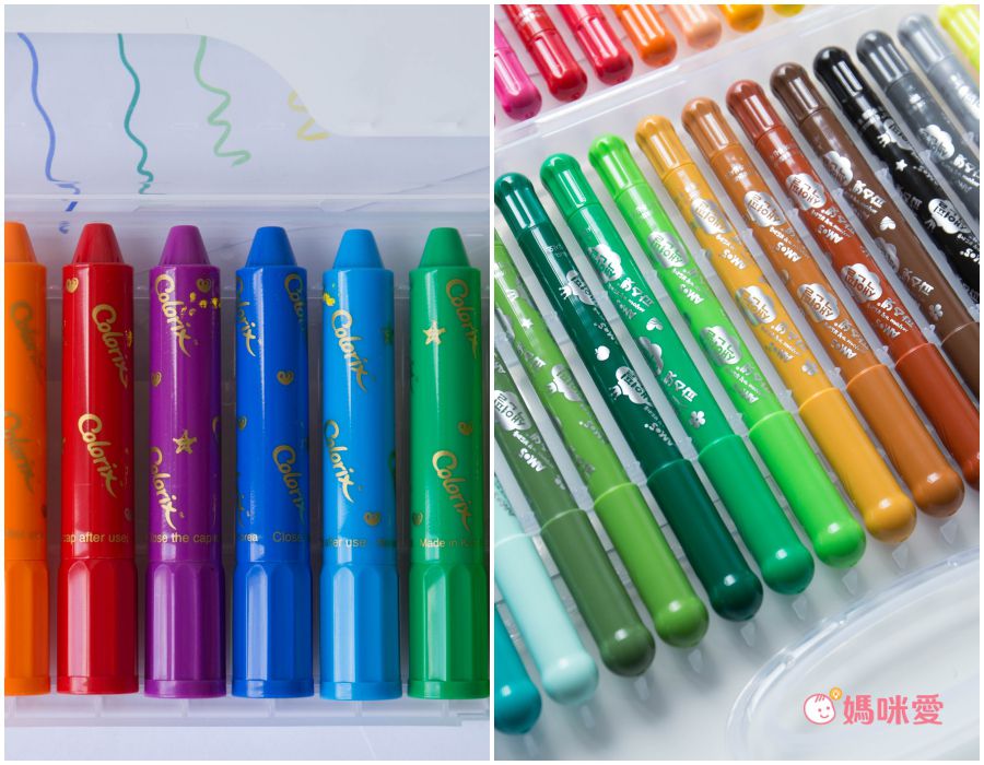水蠟筆分成粗款和細款,建議兩歲以下的孩子可以用比較粗款的,三歲以上就可以嘗試用細的水蠟筆囉!