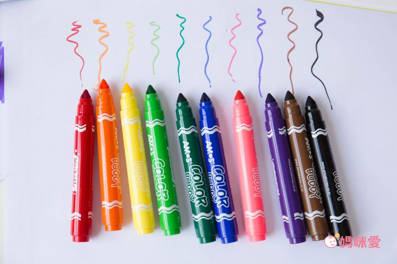 可水洗彩色筆有分 12 色細頭款、及 10 色粗頭款,二款都是錐形筆頭讓小童更好施力!筆觸和蠟筆不同,顏色也更為飽和鮮豔唷~