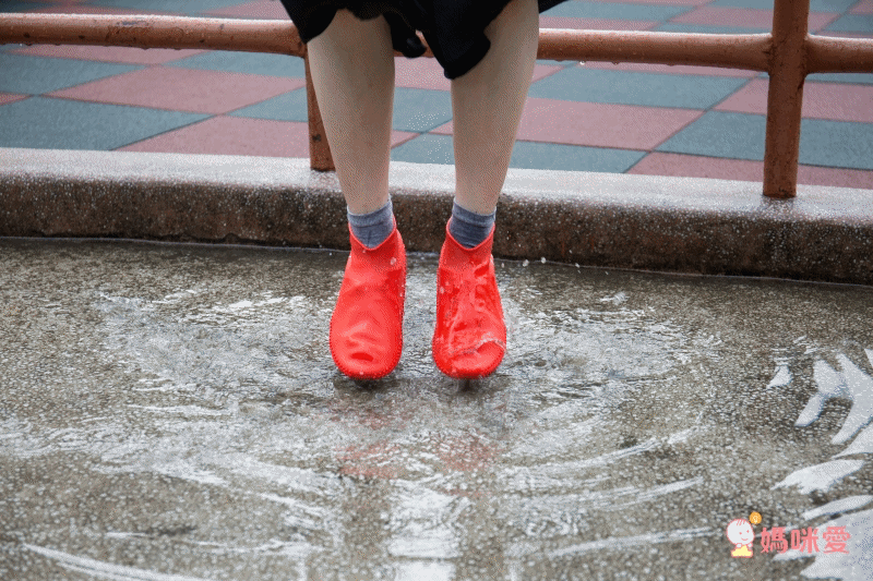 首先要介紹的就是日本Picchi,,的防水雨鞋套,顏色飽和、百搭,亮紅色的穿起來也很時尚呢!看邊媽這麼大力地往水坑一跳,下雨天也沒在怕的啦~