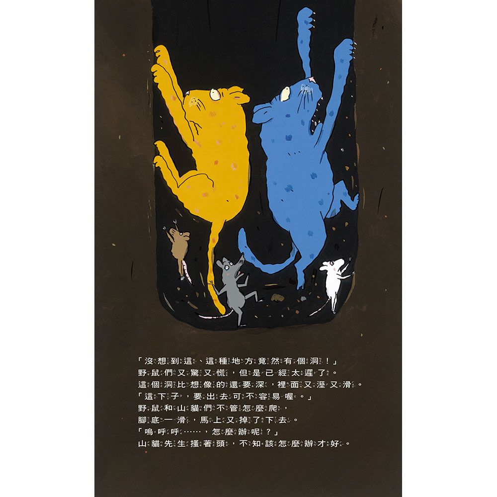 兩隻飢餓的大山貓追著三隻小野鼠跑過森林,但是誰也沒注意到前面有個好深的大洞,結果就這樣掉進洞裡啦!誰能想出安全逃脫又不讓小野鼠被吃掉的好辦法呢?