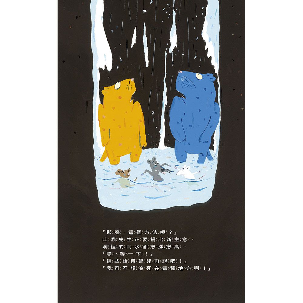 故事在緊張的氣氛中透著一絲幽默,加上直式的開本設計,充分表現出這個大「洞」的深度。貓和老鼠受困在洞裡,牠們時而苦思、時而高談闊論的神態非常生動,讓孩子在不知不覺中投入故事情境,進而產生同理心,認真面對這個可能危及性命的生存危機,一起運用邏輯思考推演出最佳對策。那麼,山貓和野鼠合力想出來的方法,到底哪個才行得通呢?相信看完故事,孩子也會跟書中的角色一樣,不停的、不停的討論,甚至愈來愈喜歡思考了。