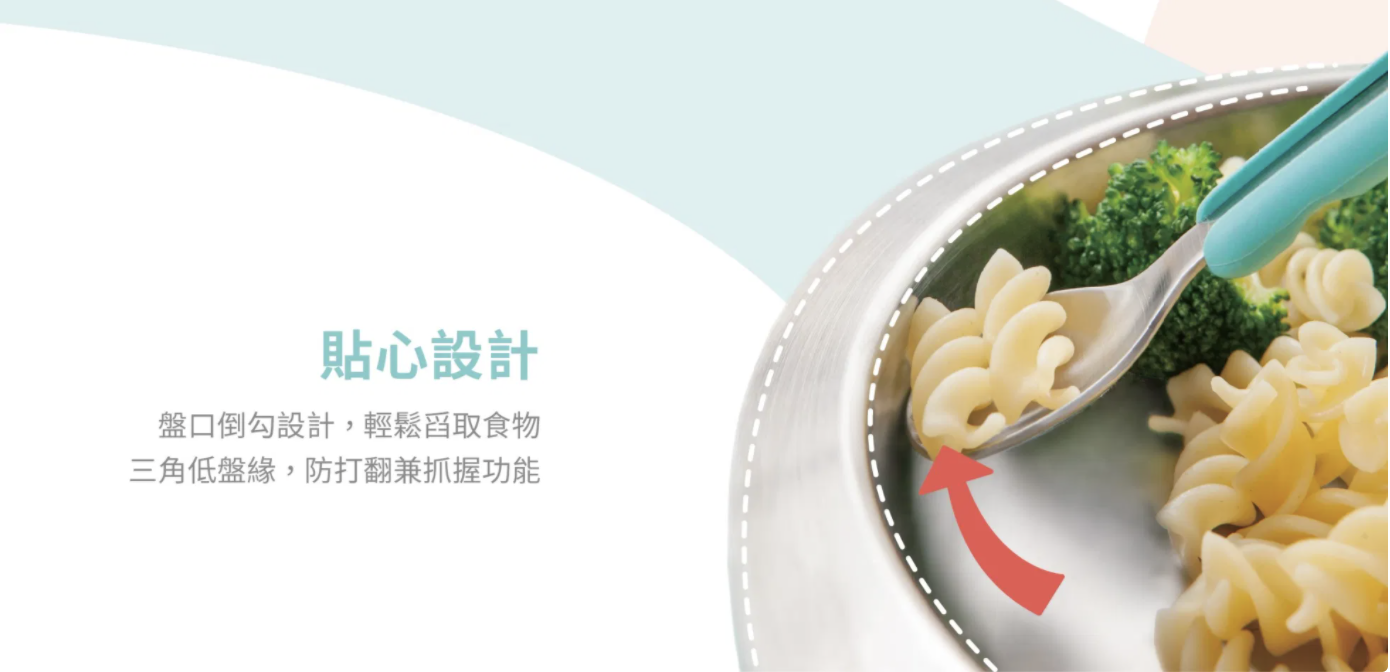 盤口倒鉤防漏設計,讓孩子可以輕鬆舀起食物,建立自主進食的成就感!