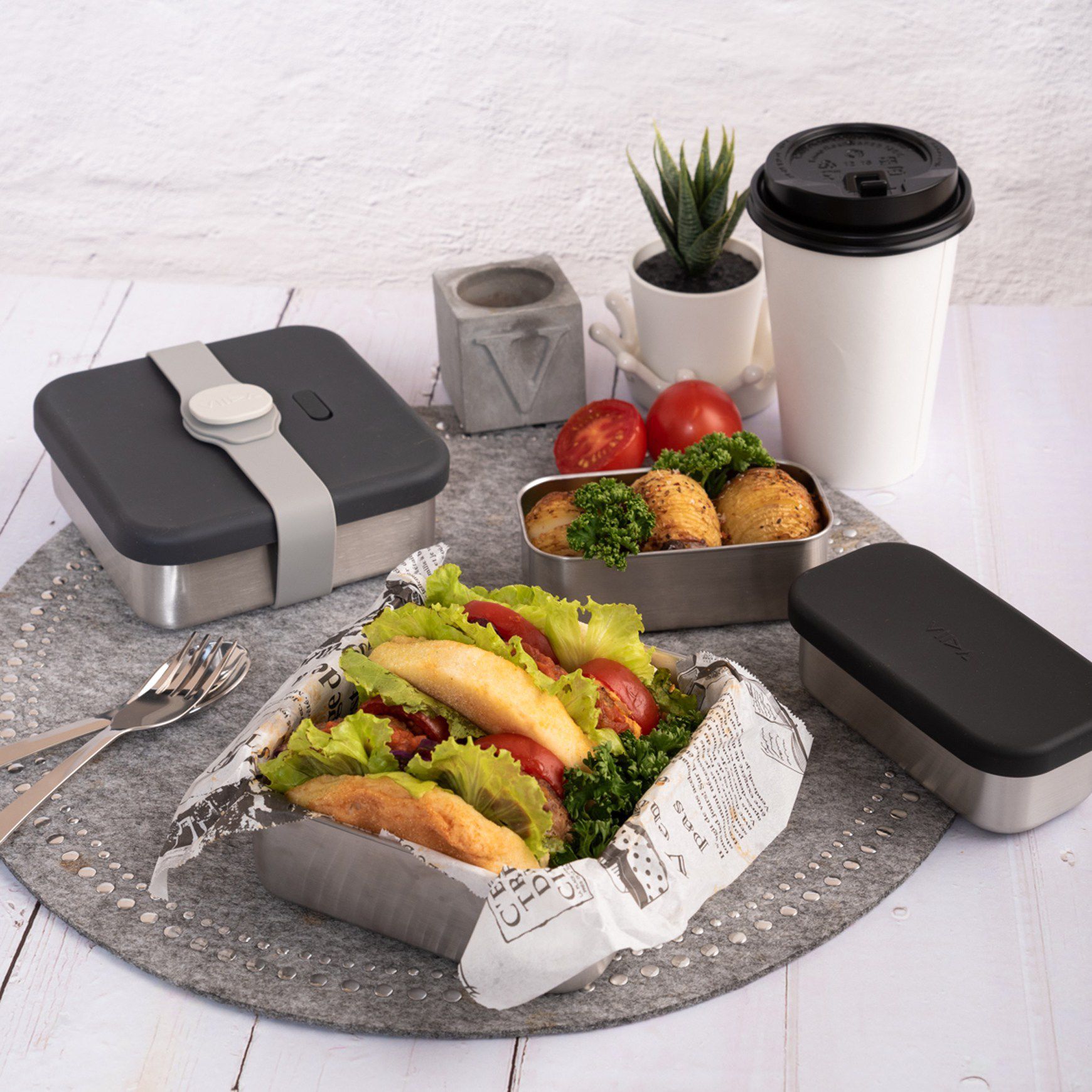 碗、杯、餐盤都有附食品級矽膠的蓋子,蓋子不僅美觀、能密合餐具,還能當防滑墊。
