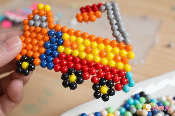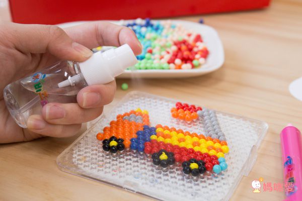 拼湊完成之後,用噴罐噴水,將益智拼珠噴濕,放乾