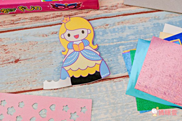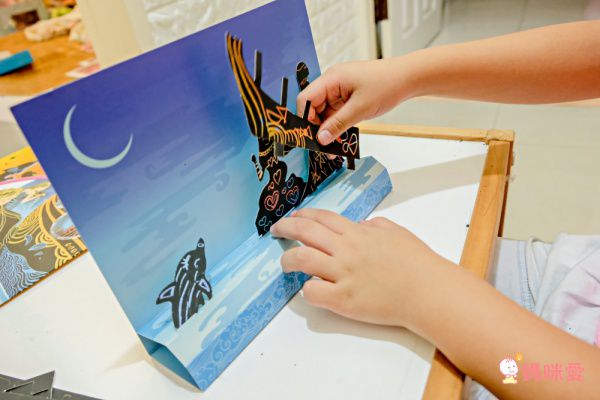 刮完後將角色、配件取下,插入背景卡紙上,所有角色就定位!童話故事準備開始上演!