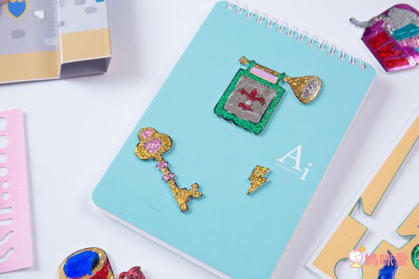 撕下貼紙貼上喜歡的閃亮色紙即可,就是這麼簡單好上手!由於貼紙有黏性,可以將閃亮紙上的顏色轉印下來,在貼的時候要將閃亮貼紙壓平~才能讓閃亮紙上的顏色均勻地轉印到貼紙上