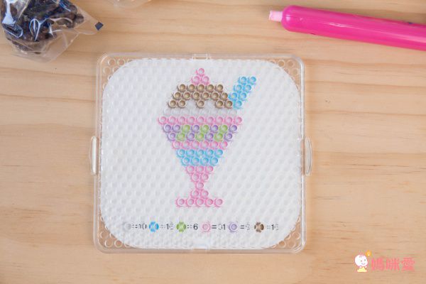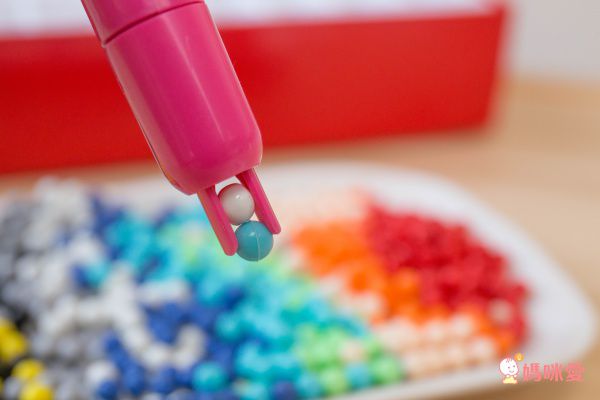然後用夾子夾取,將對應顏色的珠子放入拼盤之中