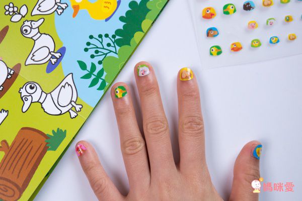 一整片貼在指甲上,材質不傷指甲,可以讓孩子挑選適合大小的指甲貼