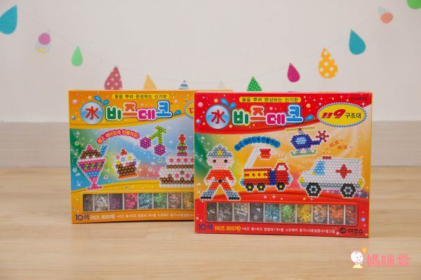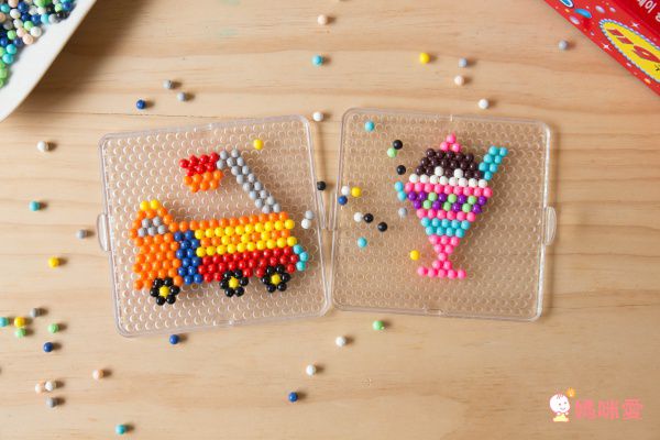 內容物:拼盤*1、說明書、噴灌*1、夾子*1、10色水拼豆共800顆、拼圖卡*4(雙面)