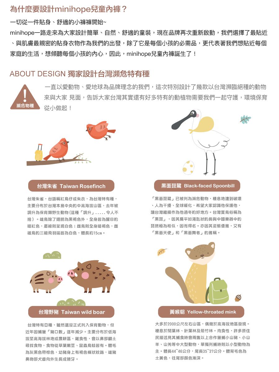 「minihope」的內褲圖案三角褲和四角褲都有,讓媽媽不擔心喜歡的圖案沒有自己要的褲型~ 包材以環保為出發皆以紙類包裝,也沒有使用膠袋,包材上還特別印製了台灣保育類動物的小資訊呢!